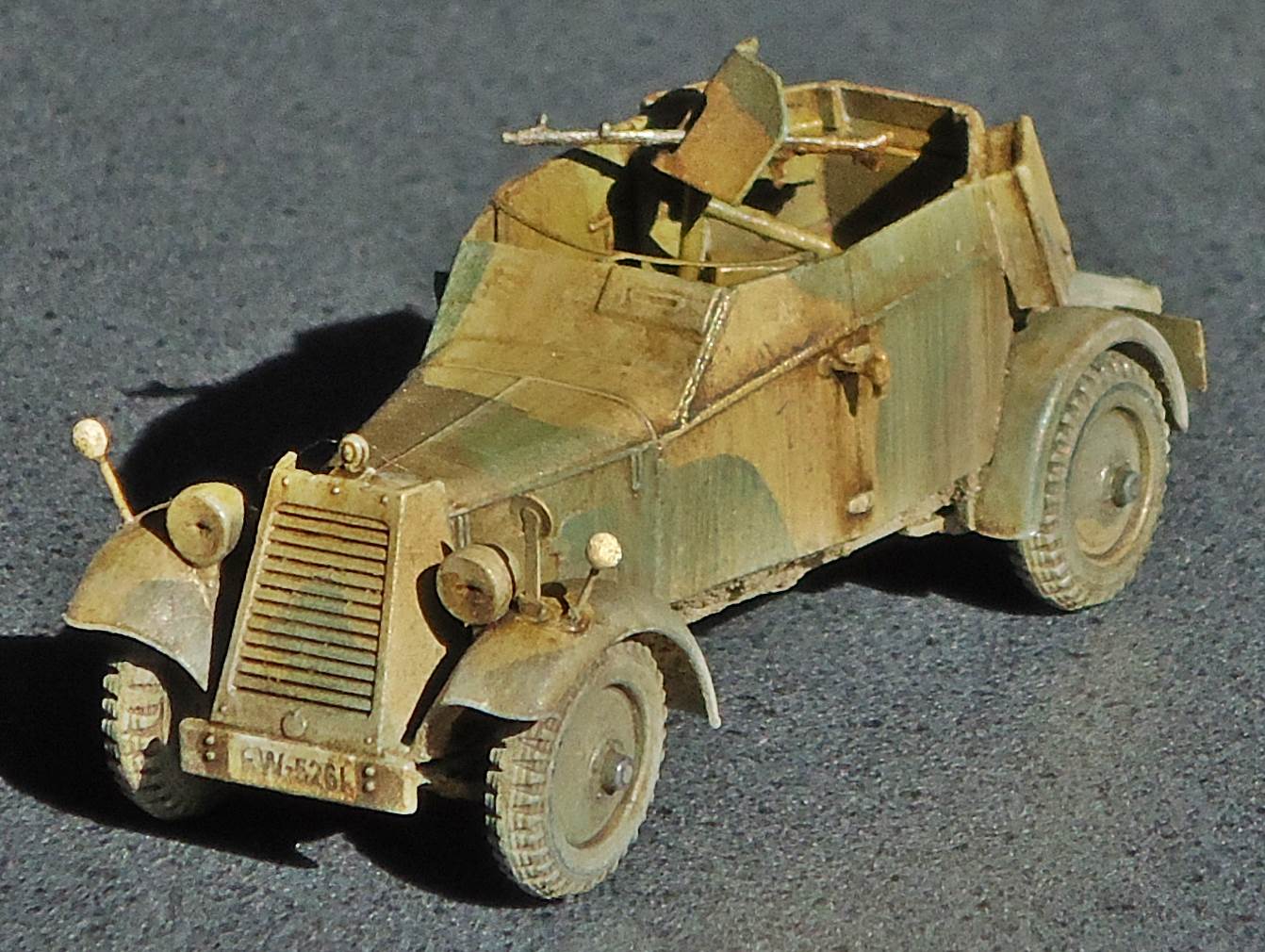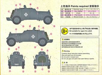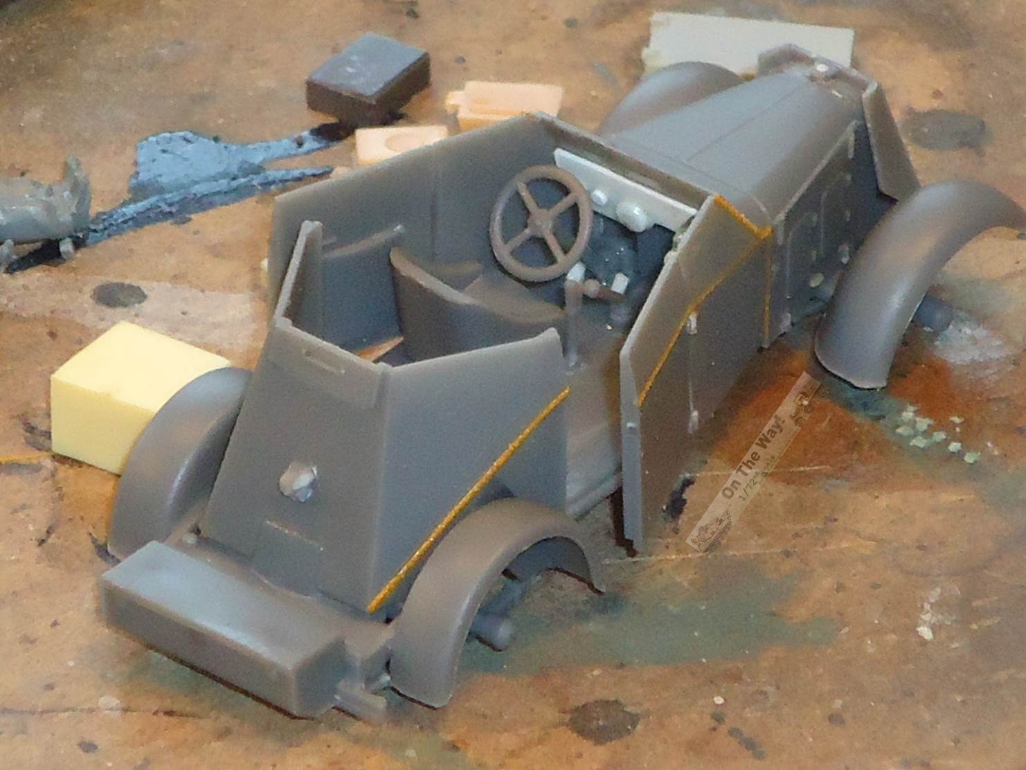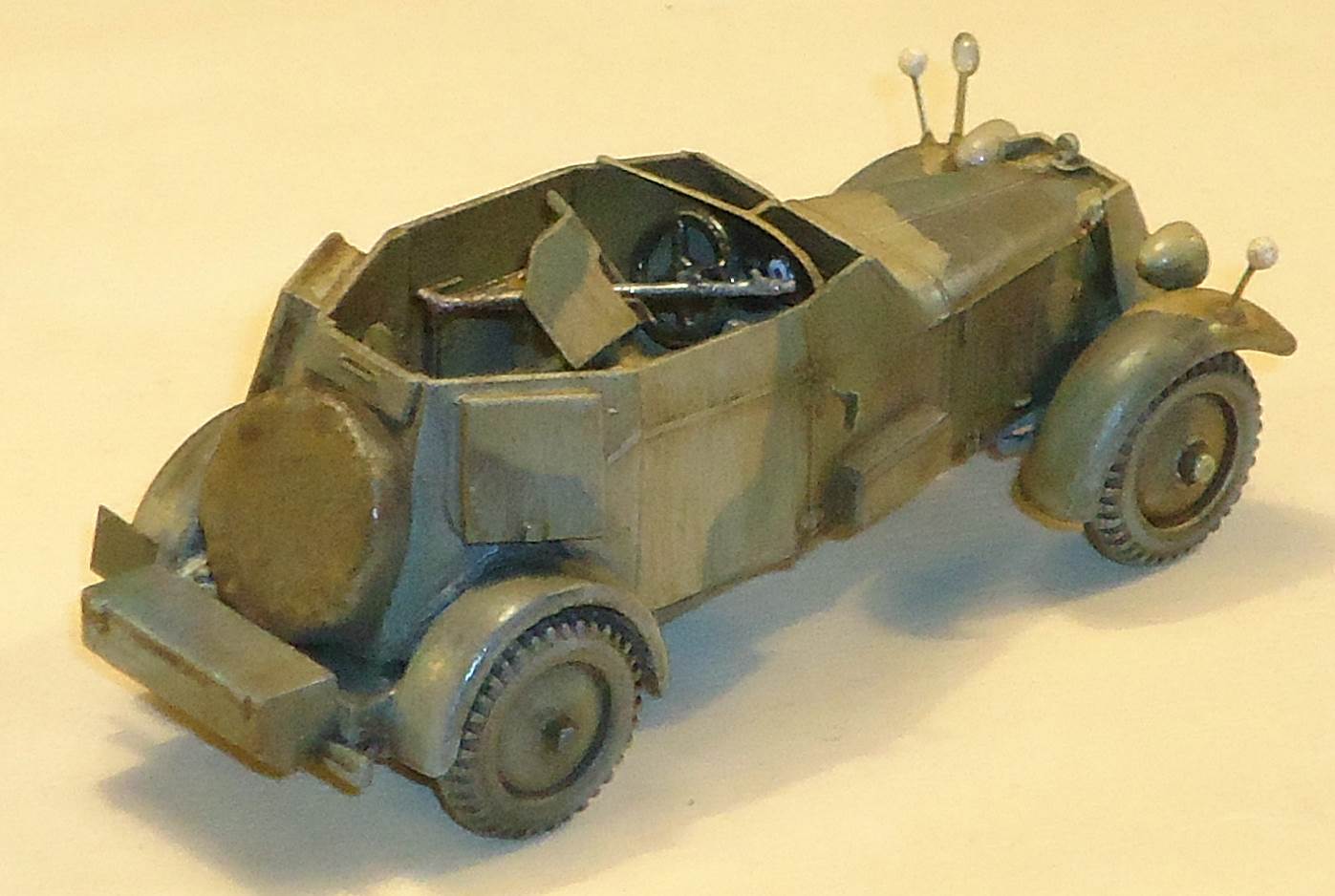 Major omissions in the kit are the boxes on the outside of the vehicle: two on the rear armor and one on the right door. (Incidentally these are also missing in the 1/48 WSW kit.) These boxes were sourced in resp. the ACE kit of the Kfz.13 and the spares box. Minor omissions are the turn indicators on the doors and the dashboard, which I made from sheet plastic and a punch-and-die set.