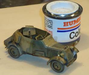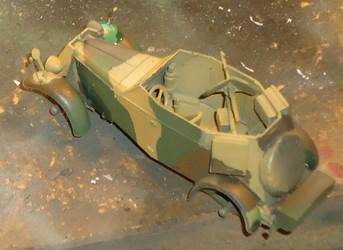I decided to paint the vehicle in a pre-war Reichswehr Buntfarbenanstrich, which is not unlike the late war three-color camo. Disaster struck when masking, as my Maskol decided to go medieval on me and turn to a sticky, almost irremovable goo, instead of a thin easily peeled off film.