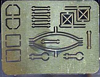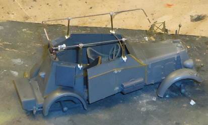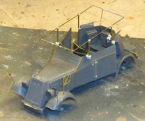 • I omitted the MG and replaced it with an extra seat (from the spare's box) and three radios on a shelf. The latter were made from plastic rods and the faces from the NH Detail PE set. The NH Detail PE set was also used to enhance the headlights and front licence plate. Some extra interior bits were added based on pictures found in [4].