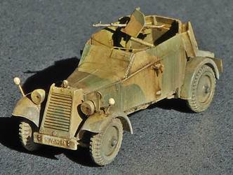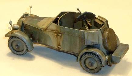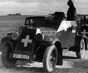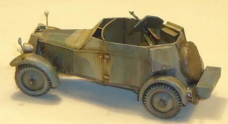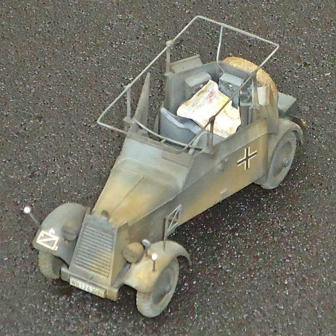 Both vehicles were designed as reconnaissance vehicles based on a standard Adler 4x4 passenger car chassis mounted with a lightly armored open top body. Maschinengewehrkraftwagen (Kfz.13) was armed with a single MG13 machine gun mounted behind the protective shield. Funkkraftwagen (Kfz.14) was fitted with long range radio equipment and frame antenna and served as a wireless radio car. Both were issued to Aufklärungs (reconnaissance) detachments from 1932 onwards and remained in service in limited numbers until 1941, taking part in both Polish and French Campaign. Both vehicles were not suited for combat but proved valuable for training purposes. Both vehicles were interim solutions with passenger car origin and its poor cross-country performance. From 1932 to 1934, Daimler-Benz produced only 147 Kfz.13 and 40 Kfz.14 on chassis supplied by Adlerwerke. Armor bodies were produced by Deutsche Edelstahlwerke AG in Hannover-Linden.