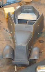 The floor has the fenders integrally attached to them (which will hinder the paintwork later) and might benefit from an anti-slip pattern. The headlights that mount to the fenders have a very weak attachment point. I drilled holes in the fenders to get a more enduring fit. ("More" in this case did not mean "sufficiently".)