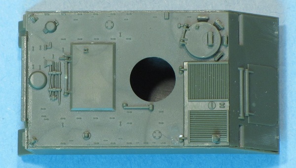 The hull is moulded in 3 main parts - the bottom including the sides, the roof including the upper front plate, and the rear plate. The engine