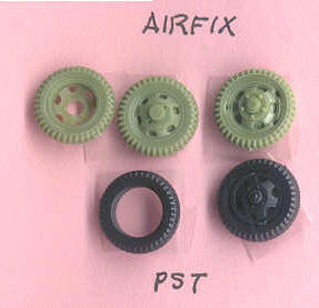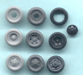 Cooperativa’s wheels are correct but molding is mediocre. PST appears to have the most accurate front wheels of the four kit manufacturers and has separate tires from the rims. Airfix appears to have the best rear wheels and both Airfix and PST have the best spare tires. All these wheels suffer the same common problem with injection molded styrene tires, that of poor tire tread pattern. Accurate cast resin tires, such as those offered by Milicast, would be most welcome. Airfix also has nasty sinkholes in their front wheels that will be very difficult to fix (thank god for mud & snow?).