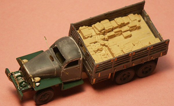 The LEVA Productions resin cargo accessory (Kit #72 E 10) is designed for the Hasegawa GMC KIT but fits well in the Cooperativa model. The larger fuel drum is from MarS Co. Extra parts from the PST GMC kits have supplied the front bumper and winch and the front fenders. The headlights were scratchbuilt from plastic sprue pieces.