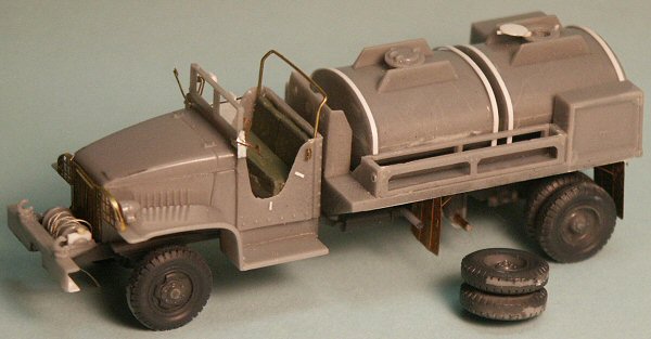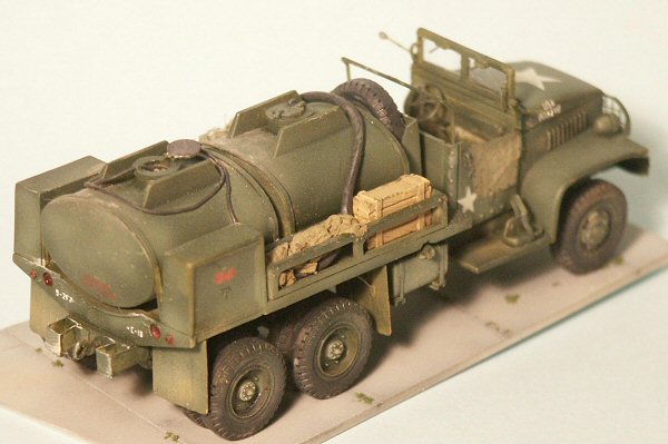 The Hasegawa GMC-353 D 6x6 750-gal. Capacity Gasoline Tanker has a completely re-built cab interior from the seat to the floor to the instruments. Tie-down bands were added around the two tanks. The front bumper winch was detailed before I read that this version of the GMC did not have a winch, prompting me to cut the winch off and replace it with an Eduard etched-brass bumper. The engine grill with headlight guards, mud-flaps, steering wheel, rear bumpers, and the gerrycan holder are etched brass.
