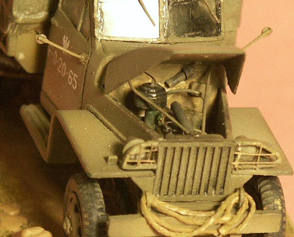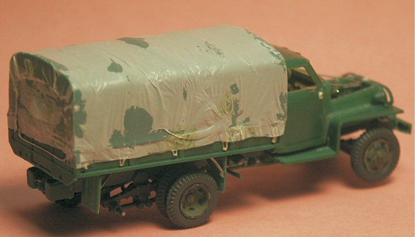 The tarpaulin (tilt) cover for the bed was improved with light-weight plastic bag material attached with super glue, and primed with acrylic primer. Twelve rope tie-downs made from fine thread were added.