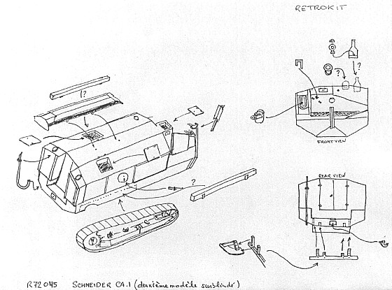 There are too few WW1 armour subjects available in injected plastic which is unfortunate. Outside of the nice injected plastic offerings from Emhar, this leaves the smaller resin manufacturers to fill the void. The Schneider CA.1 tank was not very successful. In combat it proved easy to knock out due to the exposed fuel tanks located on the side. This kit represents the CA.1 Type 2 version with extra body armour and the fuel tanks relocated to the rear of the tank framing the rear door. In all, some 400 Schneider CA.1s of all versions were manufactured by August 1918, when production ceased. At least one Schneider was delivered to Italy but it was not liked and there was no Italian production of the tank. After the war, the tanks were rebuilt as recovery vehicles and tank transporters. Six were sold to Spain in 1922, and from 1923 to 1926 were used in fighting in Morocco, the surviving four vehicles later taking part in the Spanish Civil War near Toledo on the side of the Republican army. I find it interesting that the box has the RetrokiT logo on it. At one time Retrokit was run by two partners, Dominic Jadoul and Marc Urwicz. Marc Urwicz is now based in France and continues to offer some of the Retrokit items under the new name Solfig. Dominic Jadoul is based in the UK and offers his part of the Retrokit line as RetrokiT. Receiving a box labelled RetrokiT from Solfig can only lead to confusion with the modeling public. So what kit are you actually getting when you see RetrokiT on the box? Is it a RetrokiT model or is it a Solfig model? Is it from old RetrokiT stock or a new Solfig item? You'd think that for brand recognition something should have been done to distinguish the Solfig line from the old Retrokit line - like maybe print some new Solfig labels to place over top of the RetrokiT printing on the box.