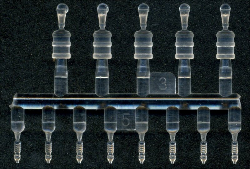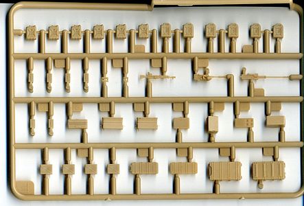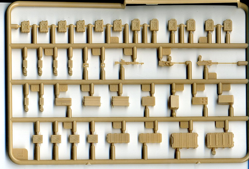 The CAD design on the box clearly shows the content of the set, which focuses on boxes, thermal containers with water bottles, water canisters, gas cans and weapons (a Browning M2 .50 caliber machine gun, a M240 and a MK 19 40mm automatic grenade launcher) with ammo boxes. Having had the opportunity to evaluate a test sample, I can not say anything about the box (there was none). In my sample, there was a sand-colored sprue with most of the parts, another sprue of transparent parts with bottles and water containers (which moved me a bit, because it is so well designed and rich of fine details that I could not help thinking about how much road 1/72nd scale has done, and I with it), plus a PE set with the locking mechanisms for the containers. The final production kit should have 2 copies of the main sprue and 1 copy of the clear one and of the PE set. | ||