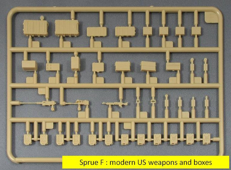 | As an extra, T-Model gives you one sprue F containing modern US weapons and boxes. This isn't a new sprue because is already part of the Modern U.S. military equipment set that T-Model also has in its catalogue. See the review here. | ||