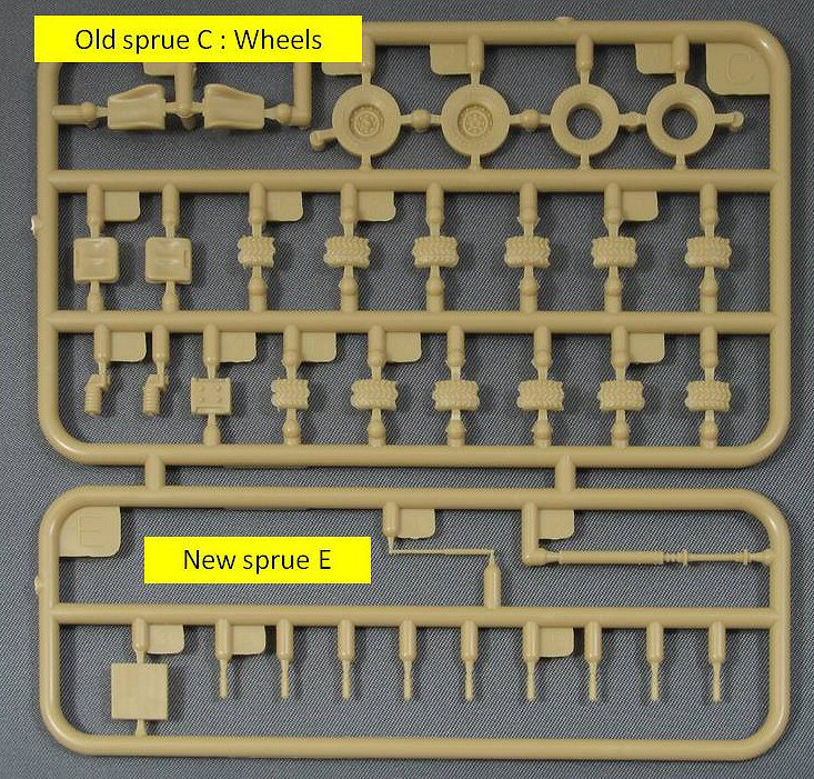 The two sprues labelled "E" (which are attached to the "old" sprue C) each contain an antenna for the CREW Duke Counter IED System (jammer in plain English) and a CIP panel (again labelled "not for use"). Be careful with those antenna; the instructions tell you to install both of them at the rear of the model, but I've seen loads of images showing a vehicle carrying only one antenna on the right, loads of images with only one antenna on the left and just a couple where both effectively were installed. So, better check your sources before getting out your glue.. |