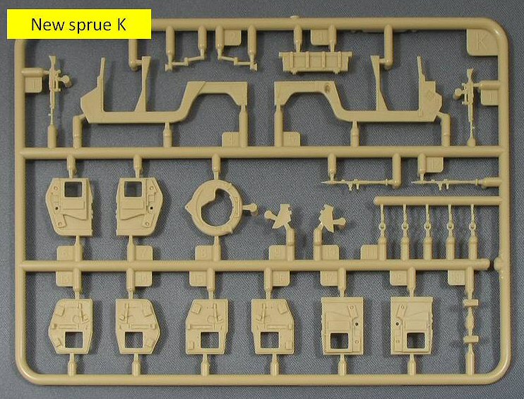| Sprue K is a completely new addition. It not only carries the Frag 5 doors, but also a number of (not for use) extra's such as two M240 MG plus swivel mounts and two RPG-7. | ||