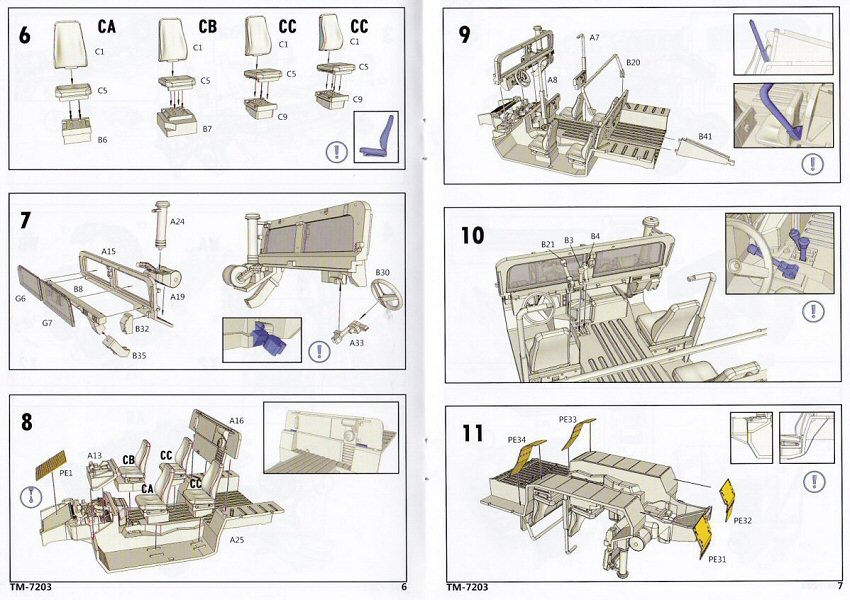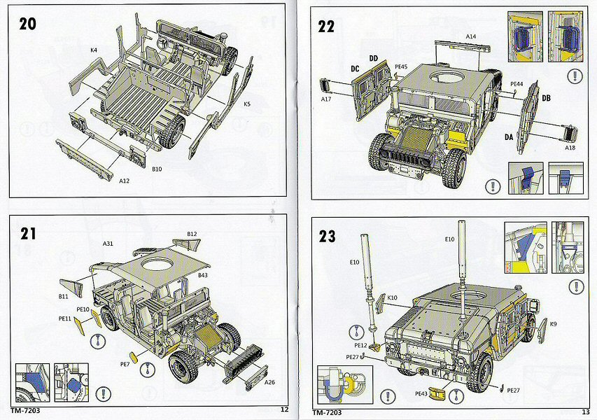 The PE set is definitely bigger than in the "old" kit and gives you all the parts needed for the basic M-1114, the Frag 5 with GPK and the weapons sprue. The only PE "choice" part is the PE grill for the hood (bonnet), which you can use to replace the plastic grill moulded in place. The other PE parts on the sheet are not replacements for plastic ones in the kit, so you have no other option than to use them. That aspect makes this kit not suitable for beginners, because it involves a lot of fiddly work bending fragile PE parts.