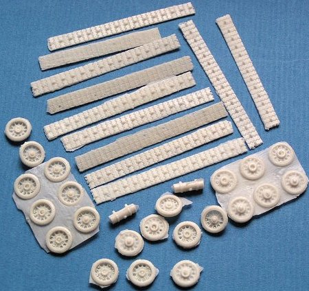 The wheels will need to drill out all of the holes. The problem is that there are resin drops in many of the holes that will make it hard to steer the drill right. The tracks have holes from airbubbles in the resin. I can't say it will be a joy trying to repair those waffle patterns. On the positive side is that all of the small parts is imbedded in a paperthin sheet of resin, so there will be no pouring blocks that has to be removed from those parts which probably should make the cleanup easier.