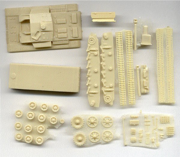 The kit appears nicely done but the resin casting is not up to par with AL BY or MARS kits. It looks like it'll make a good version of the F.8 version of the German Surmgeschutz. Judging from the parts it appears based on the ESCI 1/72 scale StuG III G kit. The resin tracks do not have track teeth like ESCI's hard tracks and there are other similarities. Parts from Revell's Pz III kit can be substituted to produce a finer display model. The superstructure is cast hollow so the hatches can be cut open for figures (no figures are included). The kit instructions are sorrowfully lacking so ESCI's StuG III instructions are helpful.
