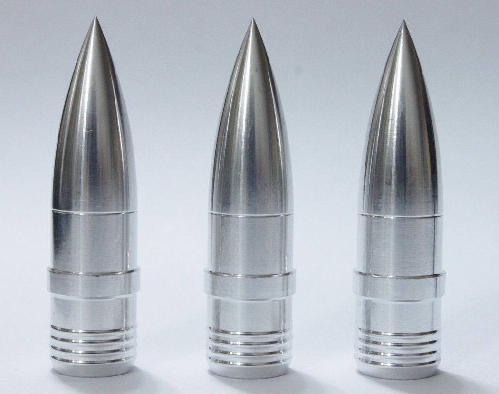 This set is made from turned aluminum. Inside the package are 3 copies of some very large shells for use with the Dora railroad gun. At the writing of this preview the Hobby Boss Dora is the only kit available in 1/72 scale. As to the accuracy of the shells, I have no clear data on the real items for comparison. I can assume that the shells will be in the order of 80cm in diameter, but for the length I have no firm data. Reference [1] has the dimensions listed as thus => Ammunition length without cap: 2.4m, Ammunition length of cap: 1.53m. As the diagram below shows, the cap (Haube) overlaps a portion of the other part of the round. What that implies for the total length is unknown. Reference [2] has the dimensions listed as thus => Length of shell: 3.6m