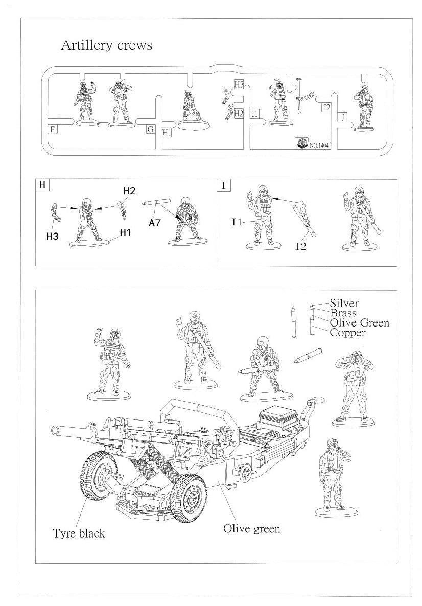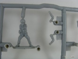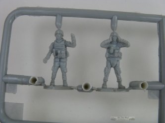 Let's take an overall look at the kit first. Inside the box there are two sprues of light olive green, hard styrene like plastic for the gun and a set of four small and very delicate looking springs. Parts total 25 on each of the gun sprues. An additional sprue contains the five crew. This sprue is molded in soft, flexible light grey plastic. The crew wears what looks more like modern style uniforms & helmets than what I've seen in period photos from Vietnam.