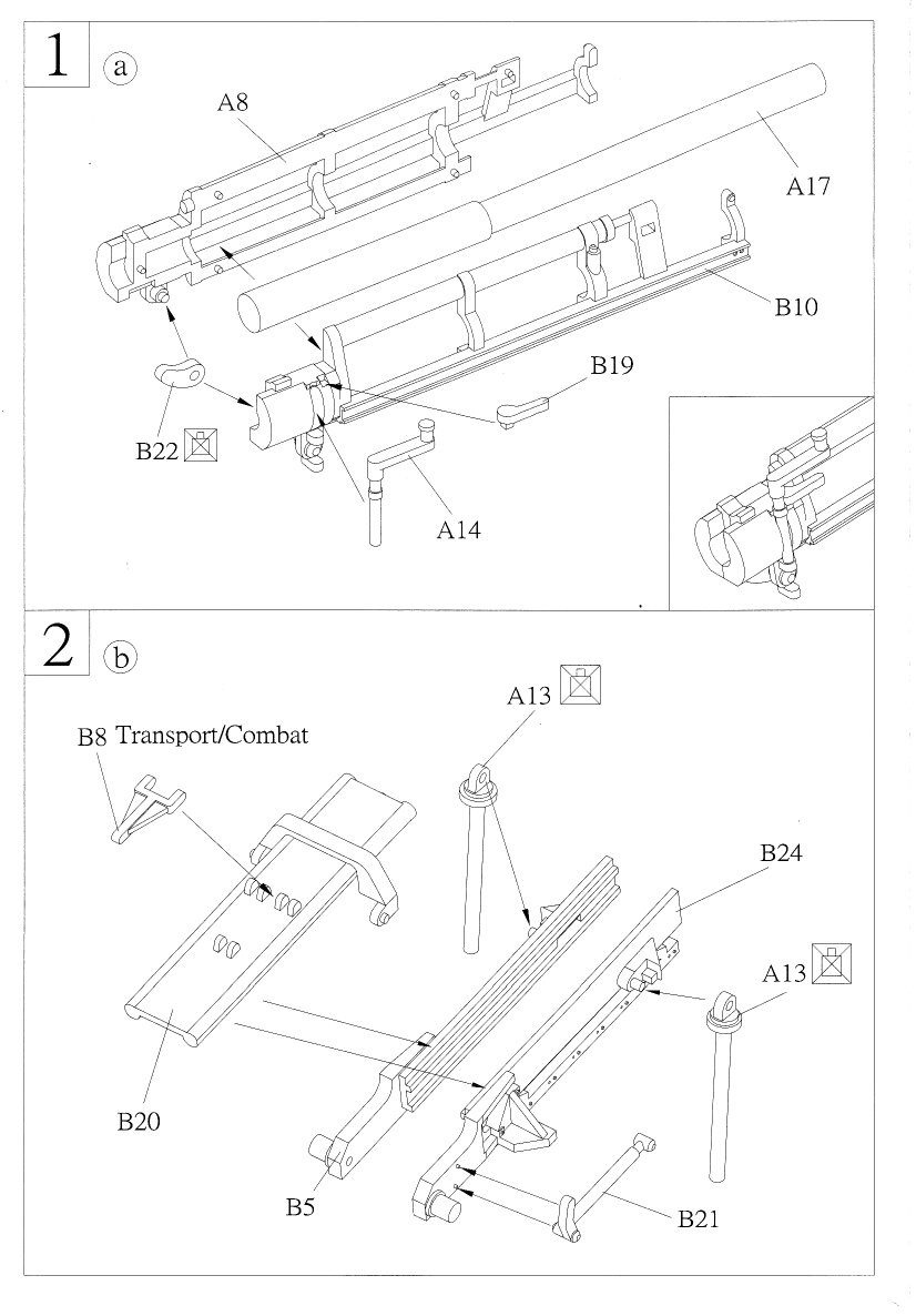 - Step 6 offers a choice of positioning the wheels for transport or for firing. The diagram is vague as to how this is done, so check your reference pictures to get this correct