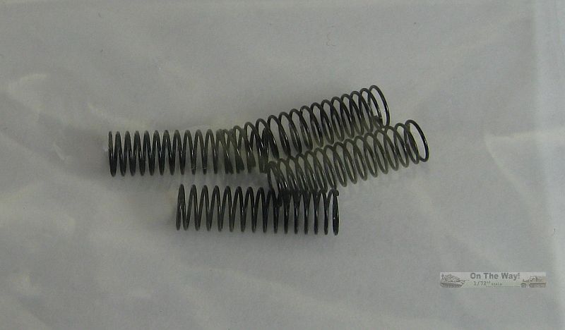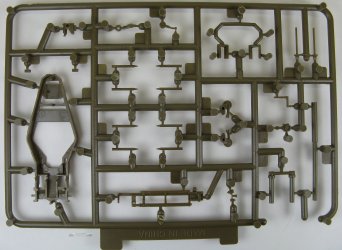 Detail on all the sprues is outstanding. Inspection reveals practically no flash, no sink marks, next to nothing for seams, and pin marks are few. Those ejector pin marks that are present are located in areas that will be hidden by other parts. The springs for the equilibrators are a nice touch. The gun barrel will need to have the muzzle drilled out (correction 17/Dec/2015: the barrel is actually molded partly hollow and thus already has an opening for the muzzle).