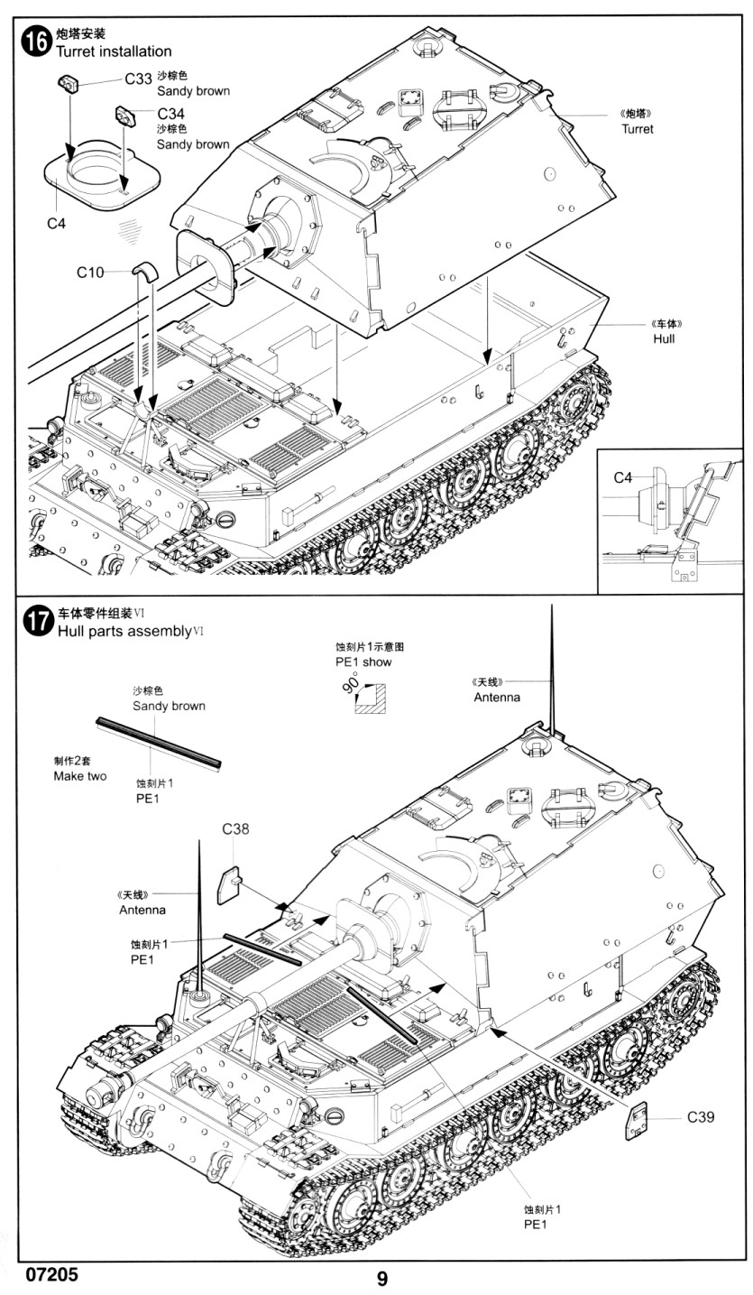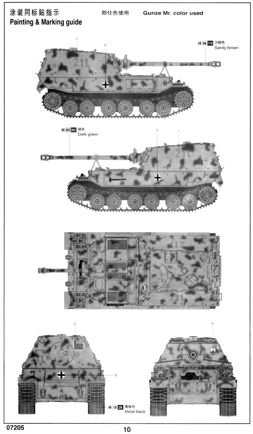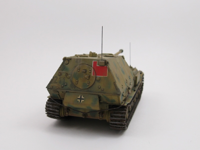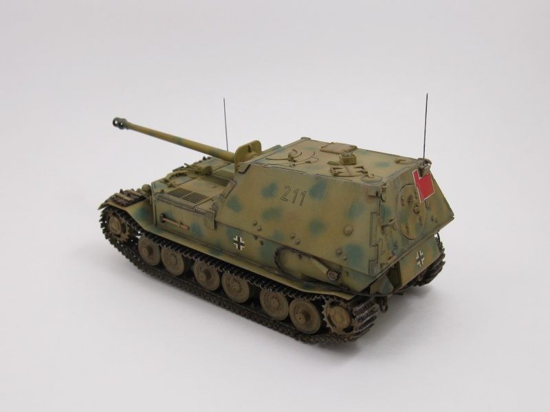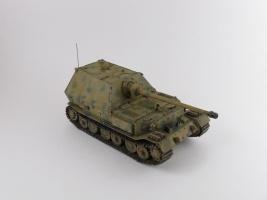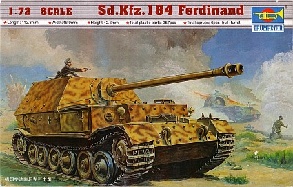 The kit comes spread over 6 sprues, one photo-etched fret and a separate hull and casemate pieces, totaling 254 plastic parts and 9 photo-etched parts overall. The decal sheet offers only one marking option which isn't identified. From what I can gather the markings are for Ferdinand number 211 of the Schwere Panzerjäger Abteilung 653, circa the Kursk battle in 1943. The decal option doesn't match the artwork on the box top. I figure the best way to describe the construction is to present my observations and changes in relation to the steps in the instruction sheet. Step 3: Step 4 (which is shown as a duplicate Step 2 on the instructions): The tracks were built in three runs to lessen the work when the painting the tracks and to make installation following painting easier. Though this did make painting much simpler I discovered that adding the parts afterward made alignment somewhat difficult and I wound up with a vehicle that has a bit of a 'knocked knee' look to the tracks when viewed directly from the front or rear. I think the problem arose with the mounting of the run that I had built around the drive sprockets and idlers. When I added my super glue to the axles and pushed the idlers and sprockets onto the axles they wound up too close to the hull in relation to the bogies resulting in a minute jog in the tracks. The road wheels fit poorly to the axle stubs. Most of the holes on the reverse side of the wheels are too big for the axles, so some care is needed to ensure they are glued on straight. Step 5 (which is shown as a duplicate step 3 on the instructions): Step 7: Step 8: Step 10: Step 11 & 16: Step 16: Step 17: Thread is provided for the tow cable but I found it to be too wispy to use and replaced it with some strands of thin wire twisted together. The cable is not even shown in the parts diagram on the instruction sheet nor is there any instructions as to how and where to place it on the model. I made some covers for the cable ends from some plastic rod, drilled holes in each end, and glued the cable and hooks into the holes. I wanted to route the cable as seen in most Ferdinand photographs but I inadvertently made my cable a tad too short so I improvised and routed it from side to side around the rear of the vehicle. I drilled holes for the antenna mounts and use some guitar wire for the aerials. The instructions say to use heat stretched sprue but I like the look of guitar wire better. The instructions also provide no information on how long the antennae should be so I guessed the length from photos found on the world wide web. The carpet void claimed a few pieces on this kit, which was unusual for me. I lost the door handle (part C32) so I made a replacement from some thin copper wire. I also lost one of the headlight covers (part D5) which forced me to replace them both with a pair found in the spares box. To make painting easier I left the door off and used the hole to insert a handle. Decals were excellent. They snuggled down tight after some dosing with Microsol solvent. All in all this is a nice kit, but the building proved that the great looking moldings in the box had a few issues with fit that make this kit more of a challenge than it first appears to be. Review sample purchased by the author. |
