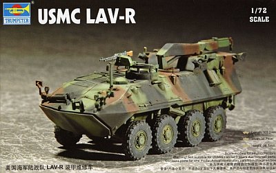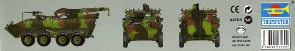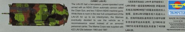 I'll start differently by beginning with the box top. You'll see a completed model on the top and on the sides some very nice color views of the camouflage scheme. I would keep these if you are using this scheme as it gives a top view of the vehicle, which should be very helpful. The notes on the box side describes the LAV 25, not the LAV-R.