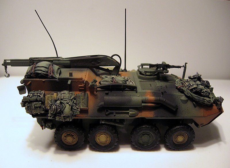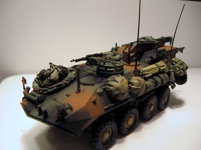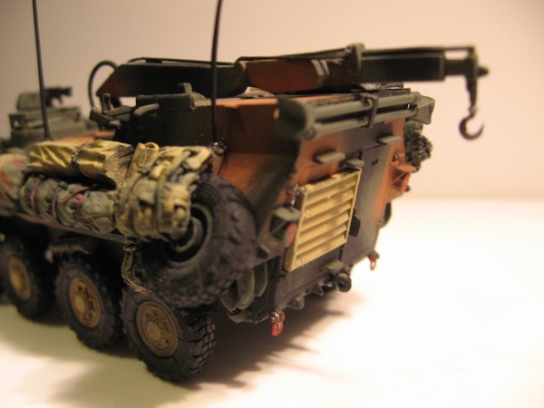I airbrushed a 3 color scheme using the box cover as a guide. I used Life-like colors which are dead flat, and PollyS Army/Marines Gulf tan for the sand color. Then, for the lived in look, I used the Black Dog LAV-25 resin accessory set. Everything in the set was used except one long roll and the large “clump” of gear that is meant to go on the LAV-25 turret. I weathered the wheels with Gunze Hemp and made small streaks on the vehicle with the same color. Most of the decals would have been covered up with the gear, so I left them all off.