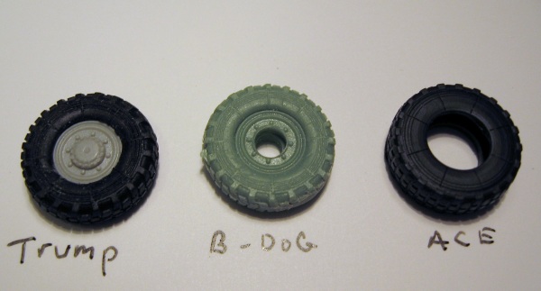 I compared 3 kit wheels from different companies (Trumpeter, Black Dog and Ace). They are all nearly alike in height and width, with the exception of the ACE kit wheels, which are very “fat”.