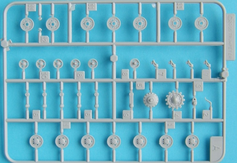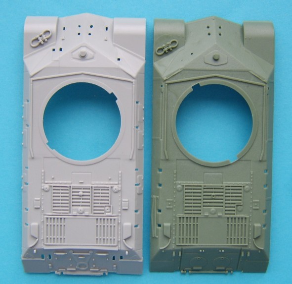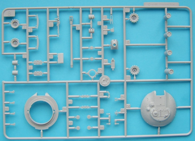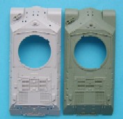Although Trumpeters release times are not a voracious as Dragons, they are still releasing at a steady rate or what seem to be in batches, with the three Japanese tanks as one batch then the AS 90 and the Strv as another and now the JS-3 and the Sherman's, what will come next?? On to the kit, it is moulded in a light grey plastic, somewhat lighter than the Dragon colour. All parts are very finely moulded, there is nothing clunky about this kit. The hull comes in two parts, with the lower being very well detailed, the suspension arms are separate items allowing for some movement in the suspension.The upper hull has some rather large placement holes for the various parts that fit to the hull, from past experience I am not overly alarmed by this as most will be filled, the other thing I like is the fact that the parts can be attached from the inside, negating any mishaps with the glue on the outside. So how does the hull compare to the Roden Hull? Placed side by side there is not much difference between them, but closer inspection will reveal several bad points on the Trumpeter kit. The first is the angle of the nose, the angle of the Roden kit is a little more acute than the Trumpeter one, the Roden one is correct, this brings me on to the second failing, the Trumpeter kit is missing the prominent weld seams around the nose. The third thing is not really a fault the barrel clamp is moulded as part of the hull, removing it will be extremely difficult without obliterating the detail underneath. However it is not all doom and gloom, at least the Trumpeter kit has the stowage bins along the side of the hull. The kit has one large sprue which contains the turret and the hull fittings, the Auxiliary fuel cells are moulded as one piece with just one end to attach, how well does this work ?? we will see. The Turret is moulded in two halves, you may wonder as to why there are two sprockets one with teeth and one with half of them missing, I will come to that later. The DshK AAMG is one of the best that I have seen, I used to think that Rodens was the best until I saw this one, why is it that the best MG's are on the IS-3?? Here are the Trumpeter and Roden turrets side by side, the main problem with the trumpeter turret is it is missing the flat area at the rear of the turret. The DshK The wheels and tracks come on two separate sprues of which there are four in total (two wheel and two tracks) As has been discussed elsewhere, the wheels are not an exact representation but they are close and better than the Roden Wheels. The tracks are of the L&L variety very well detailed and nicely thin. One surprise to me was the inclusion in the kit of a set of ready assembled tracks wheels and suspension, These are nothing like the one piece tracks in the Italeri IS-2 or the Hat kits, these are beautifully detailed tracks just as good as the Link and length ones, in fact I would say better because they are a perfect fit around the sprocket and idler. On closer inspection you can see that you still have to add the wheel outers from the sprue so you don't exactly get a full second suspension which is a damned shame Trumpeter have also included pre-bent wire for the turret grab handles, this is a nice touch but how do they look ?? until assembled it is hard to tell The decal sheet seems to be a generic one covering the IS-3M as well, the instructions show markings for 2 vehicles, with the decals in the Red rectangle being used as one vehicle is devoid os marking except for a white recognition stripe. The kit scales out to 1/72nd according to the references I have. All in all it is a nice kit with a few faults the main one being the moulded in place barrel clamp, something that has spoilt a otherwise very nice kit. References