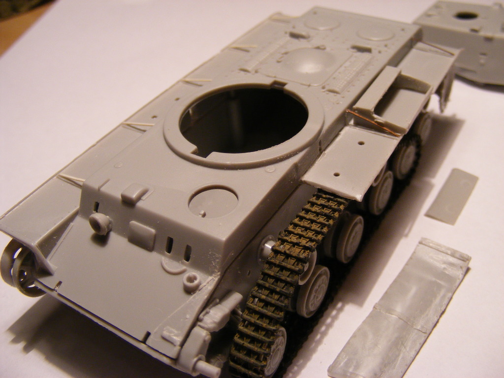 • Affixed spare panzer tracks liberated from a Trumpeter Stug III kit. The rubber tracks are better suited than link and length due to the tight curves around the road wheels.