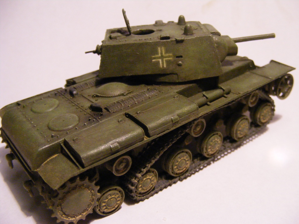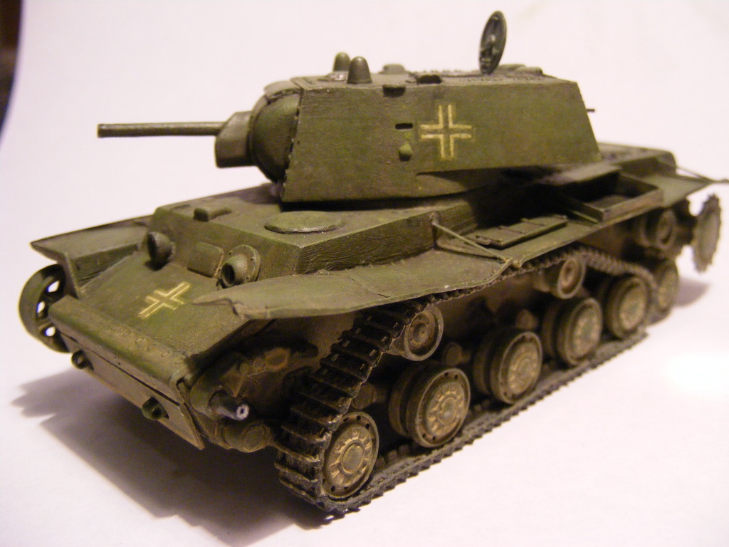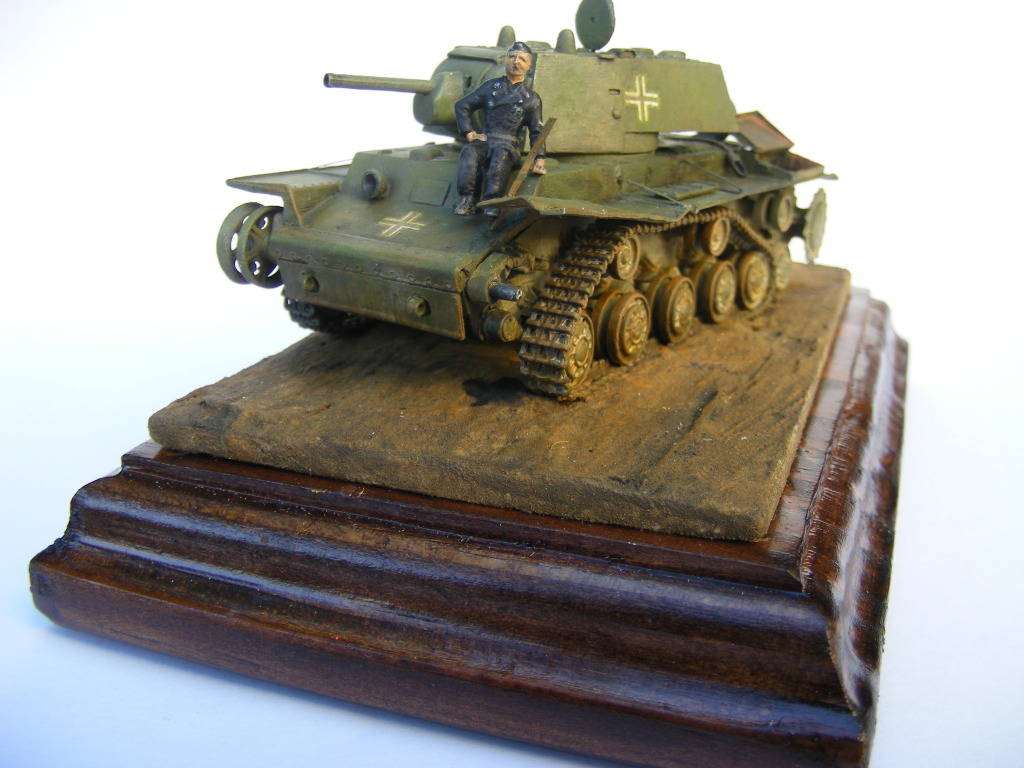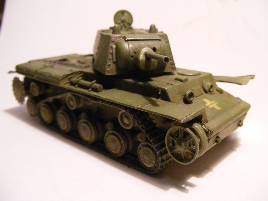 Ilian Filipov from Bulgaria sent me this picture of a damaged KV-1 in German markings, fitted with German panzer tracks. He said the photo caption suggested it was a 'mobile bunker'. His view was that it had most likely hit a mine which destroyed the track and idler wheel, and the panzer tracks were fitted to aid in recovering it. I tend to agree with his view. Either way, it makes an interesting subject for a small scene.