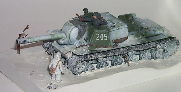 The last page of the assembly instructions gives us painting instructions for Russian Green color but no guidance on the markings for any particular vehicle. We will have to look at reference books and historical photos to model particular vehicles. For comparison and reference, here is a photo of the old LEVA Productions SU-152 model in cast resin. The overall accuracy of the LEVA model is surpassed by the newer Trumpeter model but still very good for a resin model of the 1990’s. To be honest, the resin howitzer barrel has been replaced by a plastic one from a PST model. One reason for the snow scene is to mask roughness of the cast resin track. References