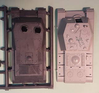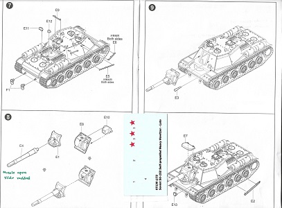 sinkholes nor flash. Above are the three hull and superstructure parts not attached to a sprue but loose in the bag and with no parts number. These casemate and lower hull parts are slide molded. The engine deck with fenders and the lower hull are that of the KV tank. On the casemate at upper right we see the three crew hatches are molded closed which is unfortunate as this boxy superstructure is crying for interior detail. The casemate roof has the two dome vents that are not present on the early SU-152 model. I see five periscopes atop the roof but the openings are all solid; it would be good to have given separate periscopes to glue on. For a good display model, I would drill out the periscope openings. I like comparing things. Above at left is the ISU-152 hull part as interpreted by PST Company. In center is the upper hull part for the Trumpeter SU-152 kit 7130. At right is the LEVA Productions SU-152 cast resin hull part. We can see that the ISU-152 and the SU-152 have similar dimensions and casemates but have different engine decks. My references indicate that the engine deck on the LEVA kit is significantly too long, but the kit does offer open hatches. The LEVA IS-152 lacks the dome vents and appears to represent the early version like the Trumpeter kit 7129. Giving a good view of the slide molded hull with suspension arms we also have a view of the two Sprue F at left and Sprue-E. The exterior fuel tanks (parts F10) are at lower left of the photo. These sprue are common to both Trumpeter kits. ![]() Sprue E holds the gun barrel (part E4) with slotted muzzle brake and the mantlet parts (E1 & E6), as well as the grab handles (parts E5, E6 and E10) for the superstructure sides. The 152-mm howitzer muzzle is molded open. ![]() Each sprue F supplies wheels and fuel tank parts for one side. In the center is the quick assembly track & wheels (parts A-A and B-B) While the track detail often suffers when the tracks are molded as one large part with the wheels, I appreciate how Trumpeter molded one side of the paired wheels separate so the complete set looks like paired wheels rather than one very thick wheel. The outside track surface detail is excellent but there is link detail on the inside surface of the track.