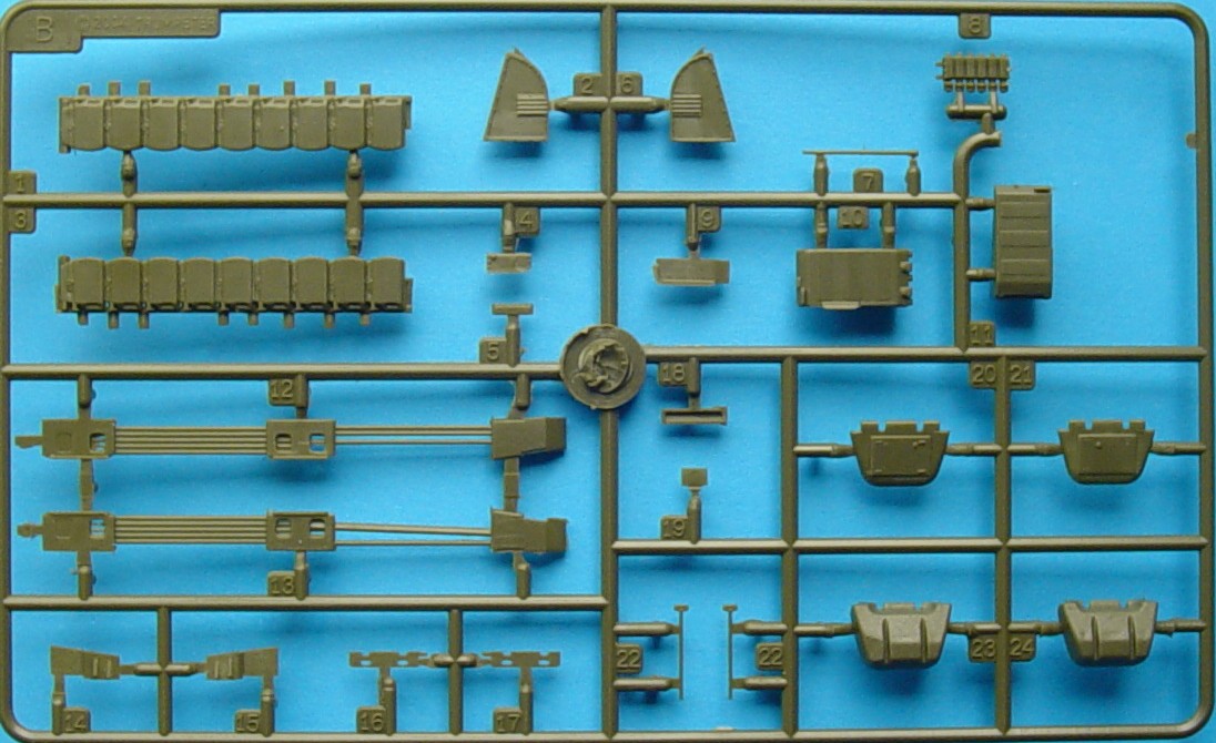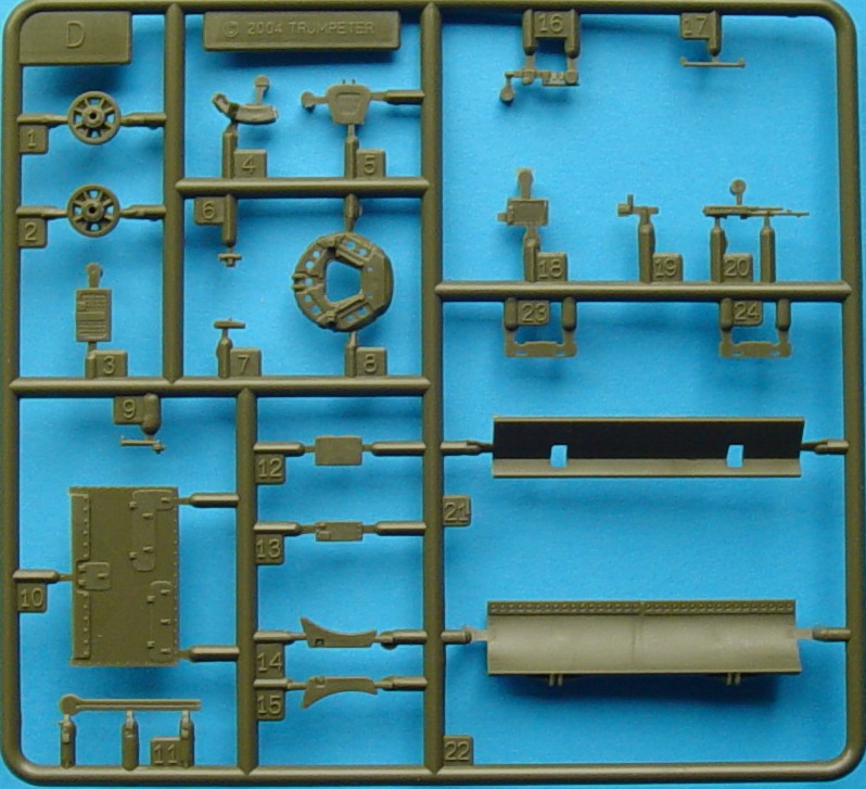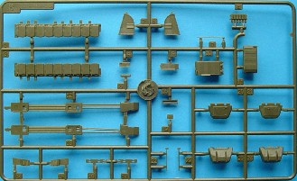 The first of Trumpeters stand alone Modern vehicles, again it is an unusual but very welcome from my point of view, choice. The hull is moulded in the usual trumpeter style of top and bottom, being fully detailed. However in difference to the JGSDF tanks, the suspension arms are moulded seperately, giving the builder the choice of how to position the wheels, through the full range of suspension movement on this unique vehicle, bearing in mind that elevation and depression of the main gun was achieved through suspension movement. Sprue A contains the road wheels and suspension arms for each side of the vehicle, there are two of these sprues in the kit. It also contains some of the many periscopes and the frontal Bar armour seen on many of these tanks.One thing to be wary of is that the suspension arms don't have any positive location, so care has to be taken when aligning them. Sprue B contains the parts for the wading equipment, the S-tank is capable of wading through the erection of a screen fitted around the hull. The sprue also contains the armoured side skirts and the rear and front stowage panniers.The front two used to house Machine guns, I am not sure if they still do or are now being used for storage. Sprue C contains various hull fittings and main gun, plus the optional exhaust. Sprue D contains the cupola and the forward dozer blade, used for self entrenching Trumpeter have continued the trend of using the same vinyl tracks as on the other modern MBT's, these again are highly detailed and fit well around the wheels. Decals are provided for one vehicle, which is obviously from Sweden. The kit scales out at 1/72nd scale according to my references. Again this is another very detailed and welcome release from Trumpeter, and one that I have been waiting for someone to release, but never thought anyone would. The kit has a lot of small parts which is why it is so detailed, not that I am complaining, but it does make this kit not one for the faint hearted. References Jane's Armour and Artillery 1990-91 11th Edition by Christopher F Foss Jane's Tanks and Combat Vehicles Recognition guide Second Edition by Christopher F Foss |