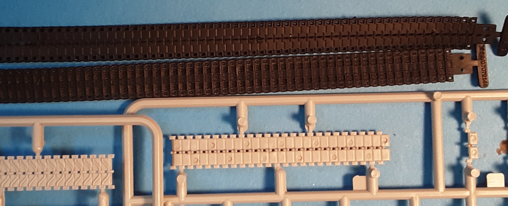 round plate. Sprue-B1 at right and B3 at left, are in the M26 and in the M26A1 kit and hold the turret and some suspension parts. Sprue B3 at far left holds the rear engine plate (part-B38), the gun barrel for the M26 with double-baffle muzzle brake (part-B37), and the gun barrel with the single-baffle muzzle brake and bore evacuator (part-B39) for the M26A1 and the M46. Sprue-B3 is not included in the M46 Model kit 7288. I am pleased that at least the commander’s hatch can be posed open though the loader’s hatch is closed. The lifting rings on the top-front and rear-sides of the turret are solid nubs; for a better display model, we may want to replace these with copper wire. Sprue-A is common to the M26, M26A1 and the M46 tank kits, and holds the roadwheels (parts A1 & A12), torsion bar suspension arms and some sprocket parts. The separate suspension arms (parts A6, 7, 10 & 11) allow us to articulate the wheels and track over irregular ground if we wish. Remember when modeling the tracks that this is “live” track so would not have any sag like we see in WW2 German and Soviet tank tracks. Below is a close-up of the track showing good detail for both types. Both appear to be all metal track. The band track used on the M26 I believe to be the T-82 type. The link and length track used on the M26A1 and the M46 are the T-80 type. On the inside face of the hard plastic link & length track are many ejector pin marks that we should fill in as some will surely be visible after assembly.