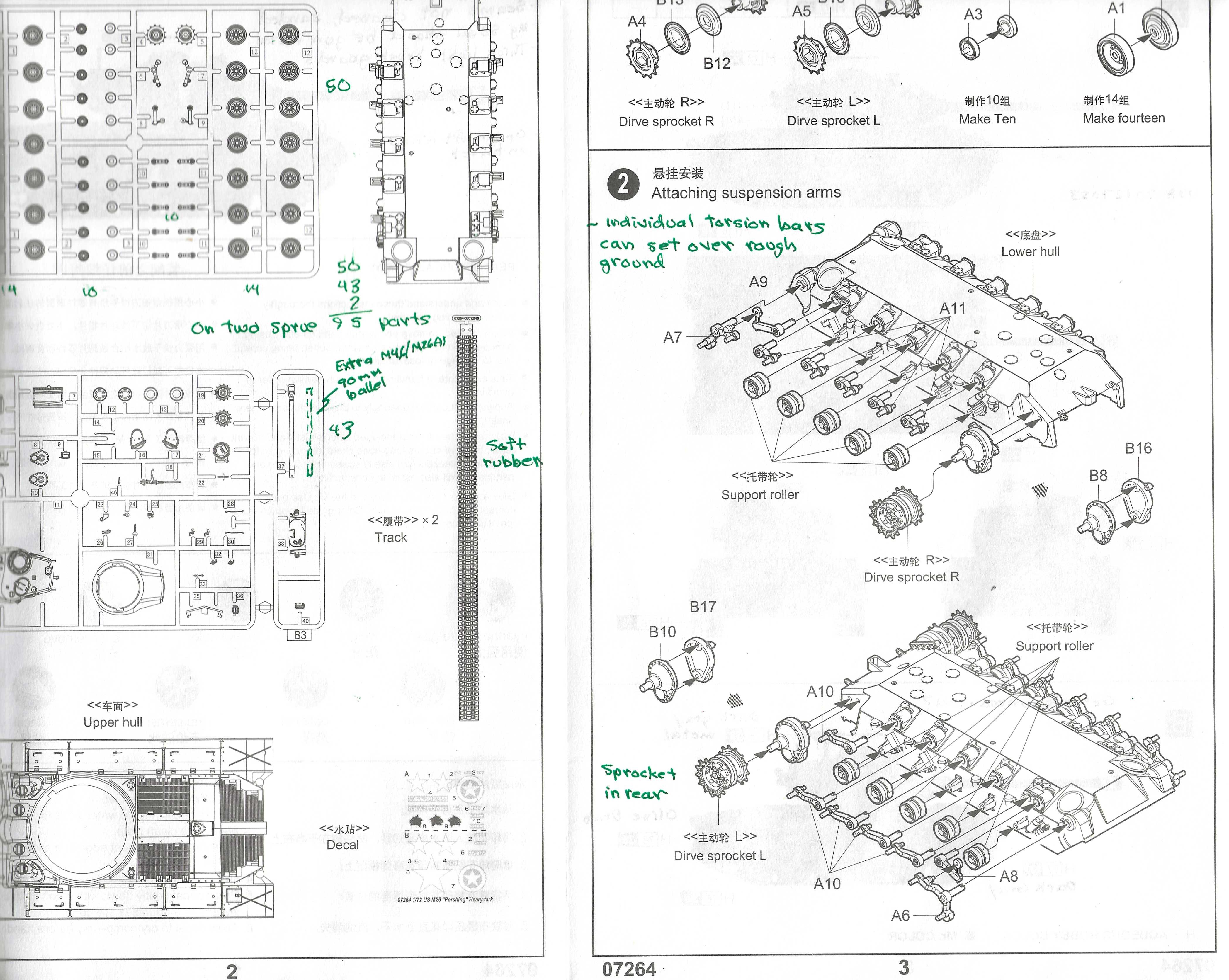 Instructions These two pages from Trumpeter’s M26 kit 7264 show the black & white drawings for painting and the water slide decal markings. The decals are on such light paper that we cannot really see what they look like; they should have used a darker decal paper. These instructions on the decal placement could be better. From the Peddinghaus Decal sheet for the Pershing these markings with the black panther head are identified as for an M26 that served with the 18th Tank Battalion of the US 8th Armored Division, Germany in 1945. These two pages for M26 kit 7264 show the parts tree and assembly of the wheels and torsion bar suspension. I think it is great that we have separate torsion bar arms so we could potentially articulate the arms (parts A10 & A11) and roadwheels (parts A1, A12) over rough ground. The lower hull here is identical for M26A1 kit 7286. Above