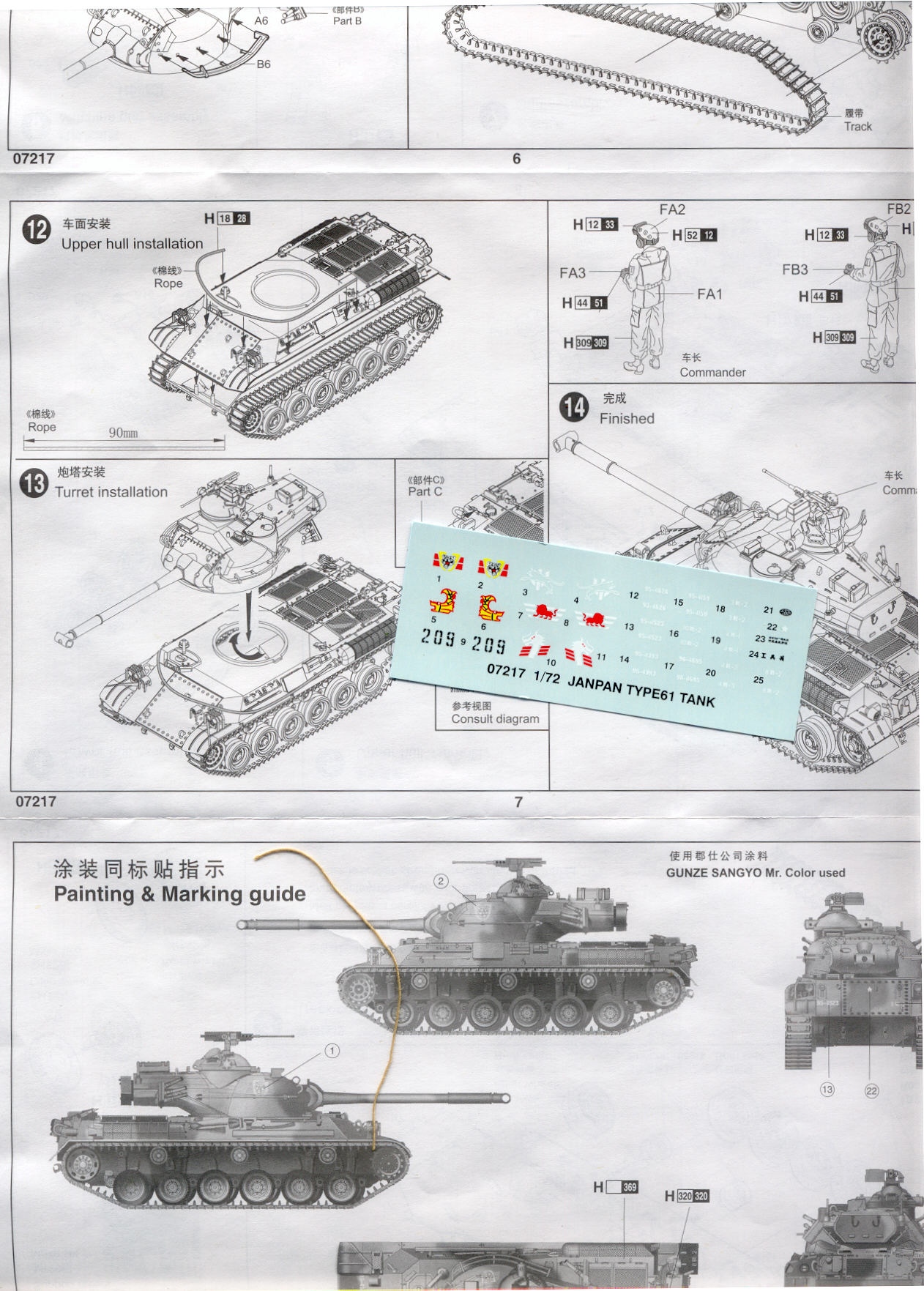 After WW2 and the Korean War the western allies saw the need for Japan's rearmament. The US M47 tanks available were found not suitable so the Japanese Ground Self Defense Force (JGSDF) developed an indigenous design. In the 1960's Type 61's were built and only served with the Japanese. None were exported to other nations, and none saw actual combat other than perhaps against Godzilla and Mothra. This tank and its replacement, the Type 74 are among my favorite cold war era tanks. Looking at it we can see the influence and, at least superficially, theresemblance to the M47 Patton tank. Examining the tank closely we can see many unique features. The Box Art (or what is supposed to be inside) Trumpeter typically shows a photo of the built and painted small-scale model on their box covers. I find it refreshing to find a very nice painting of the vehicle featured. The vehicle appears finished in a gray and green camouflage pattern with white makings on the fenders and very colorful marking on the turret for the 8th Division 8th Tank Battalian according to references. Atop the turret we see a unique dome-shaped commander cupola with what appears to be a 50-cal. AA machine gun mounted. The cupola has protrusions coming out the sides which I suspect are for a stereoscopic rangefinder. (This can be better seen on the scan of part B36 on Sprue B below.) The turret is a cast type with a long bustle in the back, like the M47. There are smoke dischargers and a long antenna mounted on the bustle side and a long grab handle. The gun mantlet has a canvas weather cover. The turret is armed with a 90-mm gun with bore evacuator and the T-shape muzzle break at the end is similar to the US M48 tank. Near the rear of the mudguard we can see a muffler and engine exhaust covered by a mesh screen. The suspension consists of six rubber tired roadwheels like on the Patton tank. There are three return rollers per side. Unlike the Patton tanks, the drive sprocket is at the front of the tank. The track appears to be all steel tread. Notice the rubber mudflaps on the rear fender. The Instructions Trumpeter gives us the standard exploded-view type instructions with 14 progressive steps. I've been warned about how thin the turret wall is and it should be handled carefully like a vacuum-formed plastic kit. At upper right of this page are the painting and assembly guide for the two crew figures. At the bottom of the scan we see a little tan colored string. Trumpeter gives this to us to simulate the towing cable as shown wrapping around the hull front in Step 12. If you look closely in good light at the hull sides you'll see faint bumps that are supposed to be the cable loops that the string ends attach to. We are better off replacing these with some cable loops taken from another kit. There are markings for what looks to be five or six different Type 61 tanks on the water-slide decal sheet but a painting and marking guide in the instructions for only one Type 61; online references should help with the rest. The markings are bright, colorful and in register. The parts There are about 117 green color, injection-molded styrene plastic parts on three sprue and the two separate hull parts. Molding quality looks top notch. This is not a rebox of the Fujimi kit Type 61 tank which I have been informed by friends is 1/76 in scale, while I've been assured this Trumpeter kit is 1/72-scale. The lower hull is slide molded with all the torsion bar suspension arms molded in place, which eases assembly. With a fine saw and a little surgery we could cut off and articulate some of the arms to pose the model over rough terrain. There is not much detail such as access hatches on the hull belly. Looking first at the upper hull part we see the single hatch for a driver, molded closed and with three periscopes. There is a large square on the glacis with bolts that I presume to be an access hatch for the transmission and breaks. The hull appears welded but I see no weld seams. At the rear is the engine deck with nice detail. Sprue B contains the turret parts B1 & B30, with fine turret handrail parts B5 and B6. At lower left is the commander's cupola with an open hatch (part B38). If we mold the hatch open we will need some interior detail added. I find it odd that Trumpeter supplies two crew figures but there is only one open hatch on the model; this is not a complaint though as I'm am always happy to have extra figures. There is a choice of two sizes of storage box for the end of the bustle (part 2 or part 10). The 90-mm gun barrel (part 21) has an open muzzle so there is no need to drill the muzzle open. There is a choice of two gun mantlets, parts 18 or 19; part 18 looks like it has a simulated canvas cover molded onto it. There are two Sprue-A containing the roadwheels, drive sprocket and idler wheels. Molding looks very good. At far left are the two soft plastic band tracks which looks to have decent outer detail and it has track guide teeth. There is no inside surface link detail and the track are very thin so Trumpeter could have done much better here with the tracks. Conclusions This appears to be a very nice rendition of the Japanese Type 61 cold war era tank and we are fortunate to have a unique vehicle as this. Now to digress a little, if Trumpeter can do a rare tank like this, why not modify their M46 Patton tank model kit to produce a much more common and wide serving tank such as the American M47 tank? References I've not yet found any reference books for this particular AFV but Wikipedia and a web search will turn up more than enough information to build this model accurately. Review sample purchased by the author. |