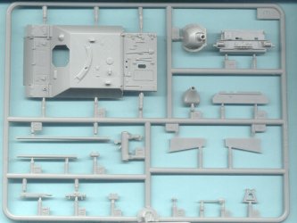 Sprue E contains the upper hull parts. In examining the upper hull, note that the gun mount for the Jagdpanzer IV is offset to the right. I find the engine deck acceptable though engine grill slats are not done as well as the Hasegawa or DML. There is a hole for the periscope gunsight but no actual gunsight included with the model.