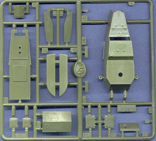 It is fairly complex, yet easy to assemble. There are many small and highly detailed parts, however, UM seems to have skipped a bit by failing to provide all the rivets that were very prevalent on this series of armored cars. Just look at the box art to see what I mean. The body and turret of this kit are completely lacking in rivets. Of course, the reason is because of the way the body was molded, and the difficulty of molding detail on vertical surfaces. I would have been happier had UM decided to make the hull from separate panels, as Mirage or RPM do with their kits, so that the rivets could have been molded on flat surfaces.
