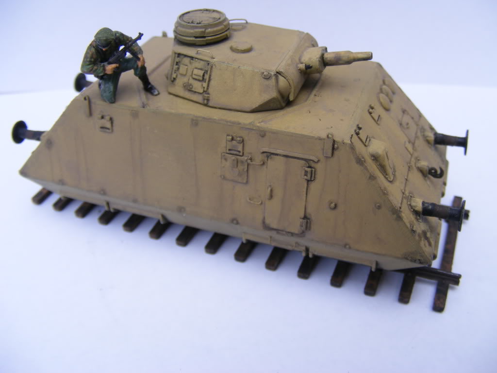 The 'Sp' is short for 'Spähwagen' (scout car) and the 'S' is an abbreviation for schwere (heavy). These cars were self propelled with an air cooled 76 h.p. Steyr motor. These cars were in combat operations from late 1944 in the Balkans and could be configured as full or half trains (Armoured Heavy Scout Trains, numbers 201-210) with a mixture of artillery, infantry and command cars, as well as with tank carrying cars, pushers & 20mm quad flak cars. Being late war, there are not a lot of photos of these, and all are black and white, and seem to indicate they were painted overall in German yellow, similar to how many panzers were painted. This makes for a simple paint job, but it's how they were. They also seemed to have no markings. Some that survived the war may have had markings added afterwards. The kit was pretty straightforward and I built it pretty much straight out of the box. Overall construction was simple with few problems. No warped pieces and no flash, except on some turret pieces. The slab sides, ends, chassis and top of the hull are all a very good fit, with no extra sanding or modification needed. There are a few very minor hairline cracks on one or two joins, which are barely noticeable, and were very easy to fill. One side of the body there is a small fissure that almost looks like battle damage - appears the plastic didn't quite cover this area & will be very easy to fill - you can see it in one of the pictures below. The buffer beam supports were not a good fit into the body. I cut the locating pins off the ends to ensure a flush even fit onto the mountings. The round buffer faces have very small sink marks - these were easy to fill. The gun barrel will need drilling out. Wire rungs were added to the body sides and the turret roof, as the kit comes with moulded on lugs that don't look good. The Panzer III turret had a bit of flash, and the turret roof needed some sanding to make it fit. I couldn't find my old Revell Panzer III Ausf. N to compare against the UM version. What is supplied in the kit looks the part, though I'm sure a Revell turret would be better detailed. The pistol ports at the rear of the turret were not cast in a fully rounded shape, some sanding improved their shape a little. An ESCI Panzer III turret I had on hand fit nicely, but as it was from a Flammpanzer I didn't use it. Part B1 was missing from the kit. This is a tiny piece measuring perhaps 2mm x 1mm and locates on the lower hull between the exhausts. I'm not sure if I lost it, if I did it must have been loose in the bag. I doubt anyone other than a rivet counter would notice it's missing, but it will be an easy job to make another from a piece of plastic rod. The axle and wheel assemblies are a little sturdier than on the D-37 & DT-45 railcars, but I glued mine in place anyway, as this will be a static model. The rail track supplied with this kit is a couple of millimetres narrower than the track that comes with the D-37/DT-45 kits. As these were probably not operational on Russian broad gauge this is probably correct. Pictures exist of these cars in Germany and on duty in the Balkans. My in-progress picture shows the model built totally 'out of the box', with no modifications, or filling, or changes, yet. I've yet to add the pioneer tools & the gun cleaning rods, which will be added after painting. Wire rungs will be added on the body sides and the turret roof, as the kit comes with moulded on lugs that don't look good. The kit comes with a set of solid Balkan crosses without outlines (similar to those used on Panzers), in black and white. Wartime pictures of these are uncommon, those that can be found show no markings. There are photos of one taken post war with Balkan crosses the same as supplied with the kit, but it's possible these were added after the war. Going by some antenna masts included on the sprues and the fact that the Infantry and Command Heavy types share approximately 90% of the same parts as this kit, it appears that UM will be releasing the Infantry and Command versions of this car sometime in the future but so far there has been no sign of them. This may be due to some serious mould problems reported by other modellers. I'm hoping UM makes all the needed components to construct a 7 or 14 car train, as I'll definitely be buying all the components, based on this kit. It was not a difficult build. |