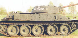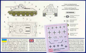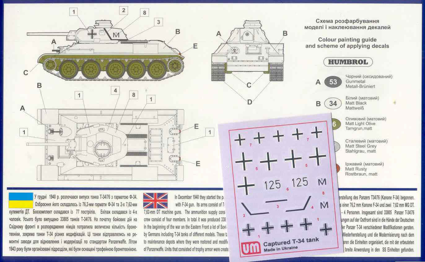 This in-the-box review is complimentary to my review of the 1/72 scale UM kit 336, the model 1940 T-34 with short 76 mm L-11 main gun which shares most of the same kit sprues and etched brass parts. Take a look at the review of kit 336 to read about the other sprues. Many of the comments on kit 336 will also count for this kit. Though labeled by UM as a model 1940 T-34/76, by all my references this is referred to as a model year 1941 (m1941) based on the longer F-34 tank gun and the bolted mantlet. I understand that both this model and the m1940 T-34 were built in the same time period with eventual preference for the longer gun causing the production of the shorter L-11 gun to cease in late 1941. German references would call this a T-34 B. Based on the number of photos I have seen, perhaps hundreds of T-34 tanks were captured and taken into service by the Germans and other Axis forces on the Eastern Front. They were even found within Axis units in France, Italy and the Balkans. Some got major modifications like this UM kit, others were just painted with oversize German crosses and used till destroyed or till they broke down. UM’s very nice box art shows the vehicle the model is based upon, a captured (Beute) T-34 m1941 with modifications made by German repair shops. We see a welded turret, which is different from the cast turret included in UM’s kit 336. The gun and mantlet are common to the model 1941 through model 1943, while the driver’s hatch, towing points, bolts across the point of the bow, DT machine gun mount and flat tracks are shared with the model 1940. The German modifications that are evident here and in the scan below are two storage boxes on the rear of the port and starboard sides, the Notek light on the port side and a Pz III/IV commander’s cupola on the turret roof. The UM model consists of about 100 crisply molded, dark green styrene parts, three etched brass parts, 20 soft plastic tires for the roadwheels, and six cast-resin parts particular to this model kit. Forty four of the styrene parts are the hard link & length track parts. Here is a former German Beute T-34 m1941 captured by Allied forces in France and now residing at Aberdeen Proving Grounds in Maryland, USA and basically the same vehicle as within this UM kit. From this view we can see the welded turret and m1941 F-34 gun and mantlet but without cupola. We see the German storage box on the rear quarter of the upper hull just like in UM’s kit and the opening in the hull for the radio antenna over the forward roadwheel. At the rear of the hull, far left, we see the spare-track storage. Lower down is the rubber-tired idler wheel at the front (right), and the five dish-shaped rubber-tired roadwheels. Above the 2nd and 3rd roadwheels on the hull side are German tool clasps. The track is the early stamped track with little tread pattern, while UM gives us a track common to 1942 and 1943.