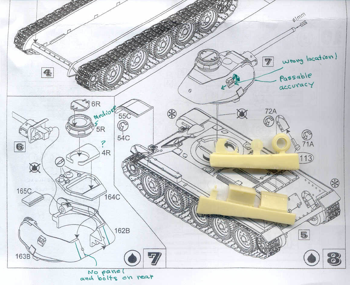 This photo shows the assembly instructions of UM’s captured T-34 turret and the resin parts, and with the six amber-colored cast resin parts just right of center. The resin parts consist of the two hull storage boxes, three turret hatch & cupola parts and a Notek light. The Panzer III cupola is adequate but not as accurately portrayed as that offered by Dragon in their Beute T-34 kits.