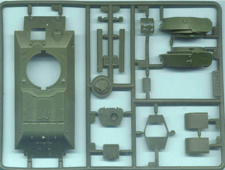 The back of UM’s box shows us the recommended painting and marking for a rather interesting T-34 used by a German unit in 1942-43 that UM does not identify (though identified on page 95 of Panzer Tracts 19-2 as belonging to the 4.(Pz.)Kp./s/Ski.Btl.1 [4th Panzer Company of the Heavy Ski Battalion] ). The sheet of UM’s water-slide decals has markings for two different T-34s; I surmise that the other set of markings, for vehicle 125, is for a different UM kit. Notice the five crosses for the one vehicle: captured vehicles had to be marked well to inhibit friendly-fire issues. This Sprue-C is very similar to UM’s Sprue C from kit 336 except for the welded turret, a few hull details and gun mantlet parts. Some weld seams scribed onto the hull would be an easy improvement. The welded turret is competently done but like UM’s T-34 m1940, the turret has no rear bolted-on hatch for removing and servicing the main gun. I have seen, and have been told by a fellow online modeler, that some model 1940 and model 1942 cast turrets had no rear hatch so UM’s turret rear may be correct but does not represent the majority of T-34/76 turrets made. Seeing this is a model 1941 vehicle I understand that it should have the rear bolted-on turret hatch.