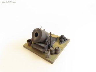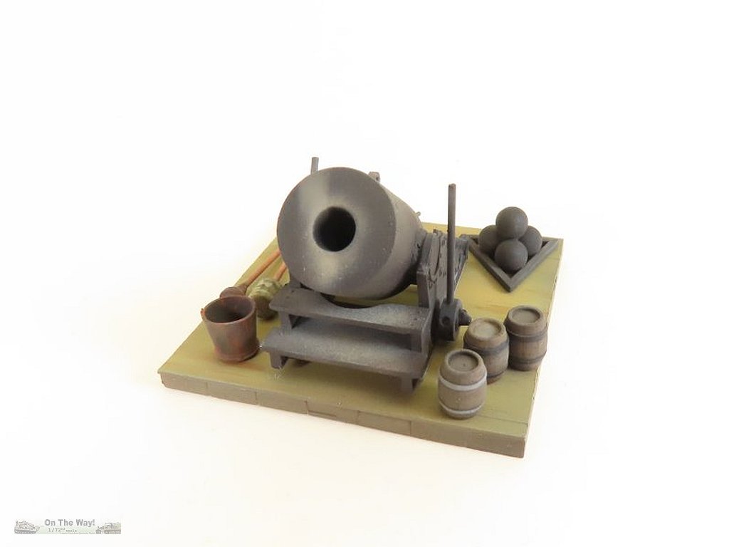 With the trucks tossed I decided to construct a small base to mount the gun, built from plastic strip and square rod. I also added a scratch built triangular cannon ball rack. If you look closely at