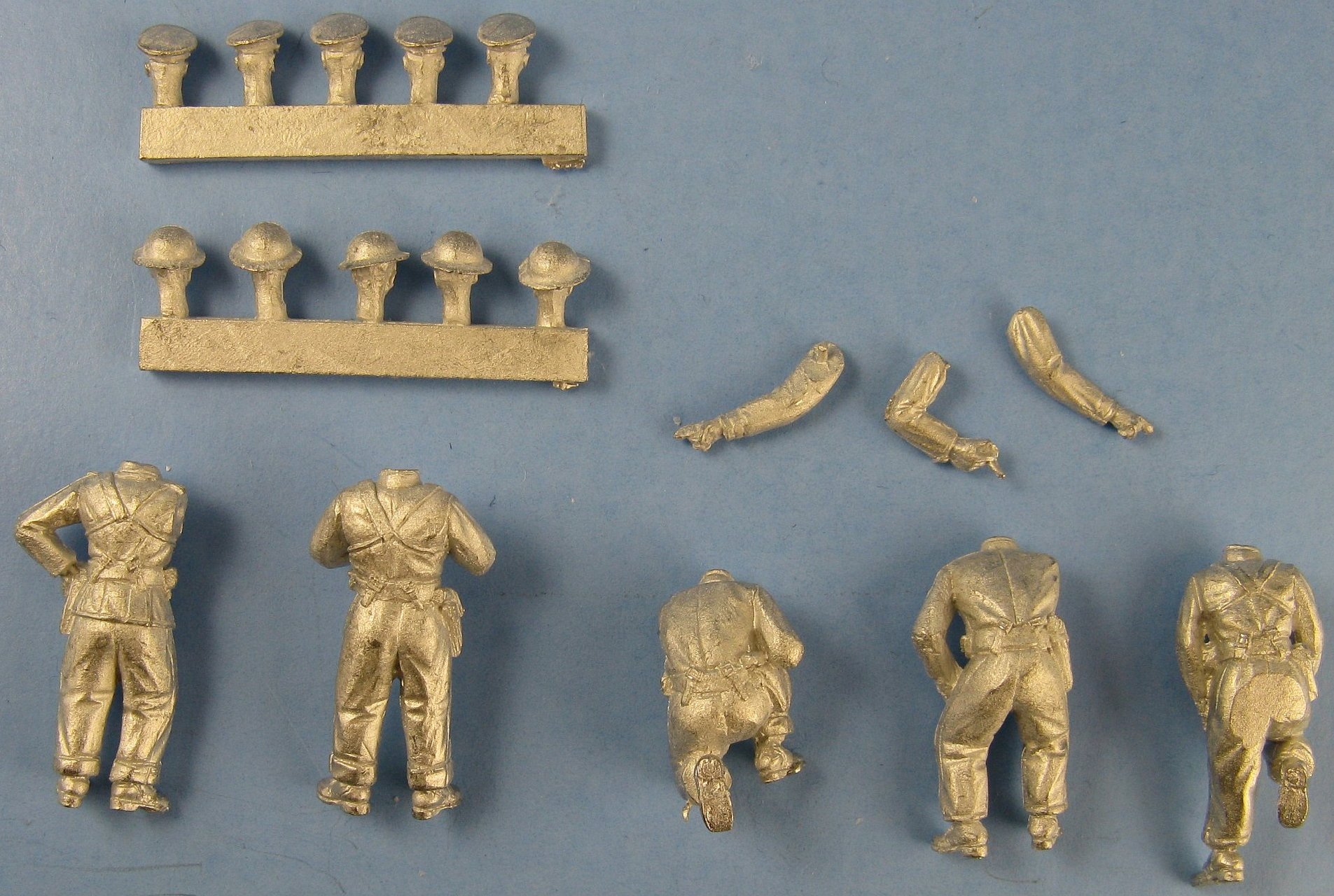 This figure set comes in a small plastic bag with a paper insert. Basic instructions are printed on the reverse of the paper and only consist of a warning to be careful cleaning up the castings to avoid damage and to de-grease the figures before priming. Also there is declaration that the parts have been cast in some sort of alloy metal with no lead content. A small colouring guide would have been nice for those, like myself, that have little or no references or knowledge of World War One uniforms anbd their colours. Paint manufacturer recomendations would also be helpful. Parts exhibit next to no flash and just a hint of a seam. Clean up effort should be minimal. You get 5 bodies in various poses. Arms and heads come separate. There are 3 arms, two of which appear to be identical. Heads come with helmets (5) or hats (5). For the helmets there are two with the chin strap across the brim of the helmet and the other three having the strap run under the chin. With 5 bodies and 10 head versions the modeller has quite a few options when mixing and matching the body parts. Scale is listed at 4mm to the foot, which works out to 1/76 scale. I measured the parts to see how tall a completed body would stand. Using my trusty dial calipers I measured the longest bodies, which came to 0.80in, and each of the heads, which were about equal at near 0.19in. When added together this comes out to 0.99in which is just a tad under 6ft tall in 1/72 scale. When one considers that the average height of a US soldier in World War Two was 5ft 8in (I found this on aweb site someplace), and I would suspect that World War One soldiers would be not too different, making these Brits toward the tall side for service men and should be more than acceptable for most applications. Preview sample provided by Barry Williams of W^D Models. |