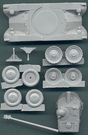 The casting is very crisp, with no flash and no air bubbles that I can see. The wheels are highly detailed with a decent representation of tread. Being a solid-body kit, all of the hatches are closed, which is unfortunate. The gun barrel is molded straight as an arrow. No markings are included, and the instructions, which are simple four-view diagrams, are adequate, considering the simplicity of the model.
