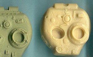 A close-up shows a heavy cast metal texture on the cast turret. To me the cast texture appears a bit too prominent. I notice some air bubbles needing to be filled on the gunsight periscope, on the edge of the ventilator, and on the lower right side. The turret is missing the additional cheek armor. If this particular turret model is a new production it would have the cast-in cheek armor on the forward right side; if it is a recycled turret, it should have welded-on appliqué armor. The large hole to the left of the ventilator is for the spotlight but I do not think it is in the correct location, the bump to the left of this hole is for the spotlight cable. At far left is the hole for the smoke mortar. The commander's