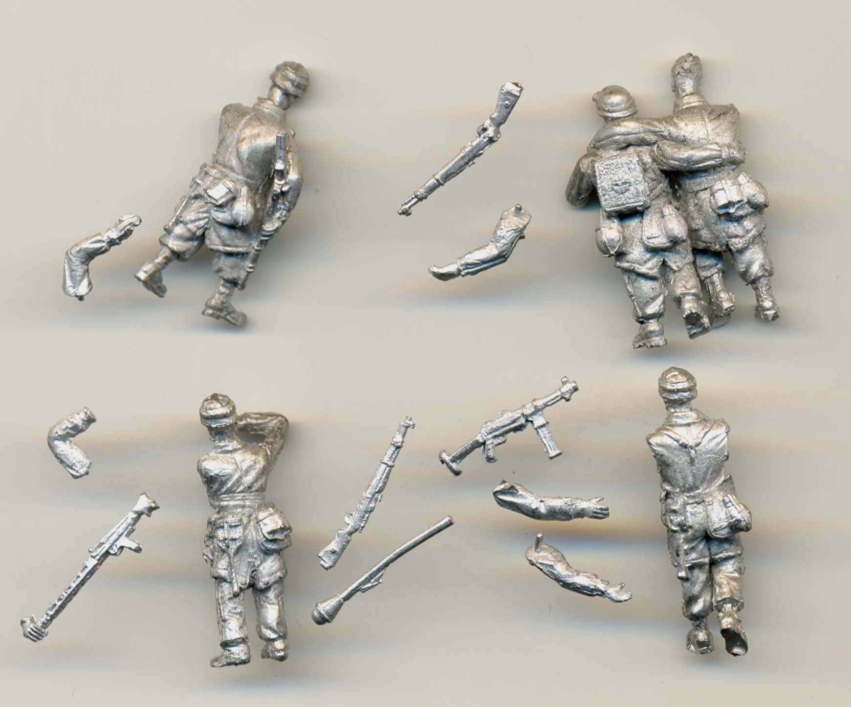 Wee Friends has started to re-release CMSC's metal figures. This used to be set DF10 and is now in Wee Friends' catalogue as WFM72007. We can be very happy that Friendship Models chose to resurrect this line as these are wonderfully sculpted items (by Tony Boustead). As with almost all metal figures, a seam line is present, but this is very minor and should be easy to remove with a hobby knife. No other casting defects were found. Detail is abundant and facial expressions among the best I have seen in this scale. About the scale: they are labeled as 1/76, but the figures measure approx. 23-24mm, and their anatomy leads me to believe they would be perfectly suited for 1/72. You get five figures and five weapons: The set comes packed in several plastic bags. In the pictures I've grouped the items like arms, bodies and weapons together per bag, as I suppose these are meant to belong together, although I guess you can easily swap arms. Sample kindly provided by Ian
