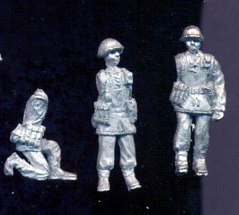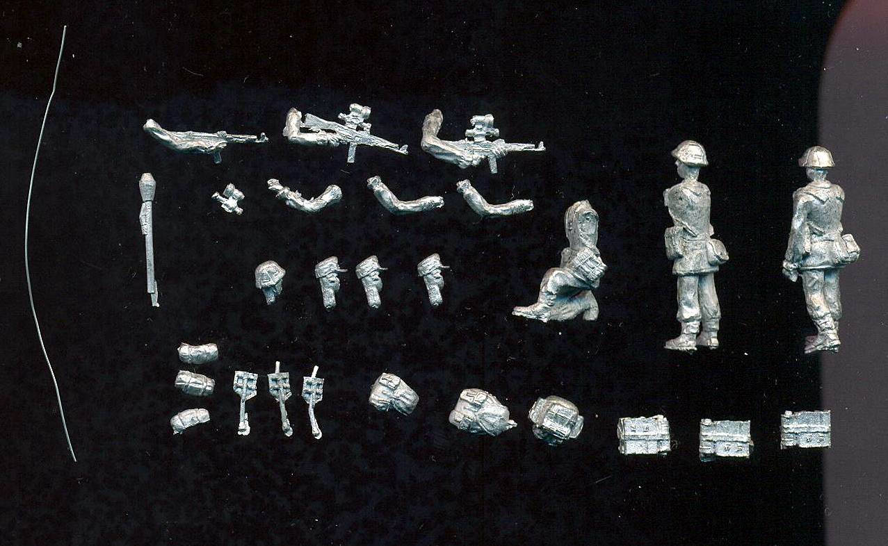 At the end of the Second World War Germany started to field a small number of AFs with infra-red (IR) vision devices. An even smaller number of individual troops were equipped with MP44s (aka StG44) that were fitted with the Vampyr IR scope (as shown in this picture). This set gives three figures that can be portrayed as such. Two of them are upright, one is kneeling. All are carrying smocks and MP44 pouches. Only one has a separate head, so I am not sure if the set is supposed to have three identical heads with a cap and one with a helmet as separate parts. I also have the impression that one of the separate arms is a double. If you look closely, you will see that only two of the MP44 have the IR device fitted integrally, while there is a separate IR device in the set. (It appears to have broken off the rifle.) It is obvious that you can alwas shave off the IR devices, if you want more regular troops. If you do so chose, then you can fit the packpacks to the figures, if not you are required to fit the battery packs. Spare parts come in the form of shovels and small packs. There is also a Panzerfaust, but I am not sure which figure should be bestowed with that piece of equipment, but it is probbaly one of the standing ones. A small strand of wire is also provided, presumably to connect the rifle to the battery pack; it is not clear how this is to be done exactly. Casting is excellently done is sculpting is quite convincing, with perhaps the eye sockets a bit deep. It is to be seen how these will look after some paint is put on. Note that most of the nightfighting troops were clad in Leibermuster camo (which had special IR properties), so you'd better put some money aside for high quality brushes and polish up your painting skills. In all a very original set that I personally welcome.
