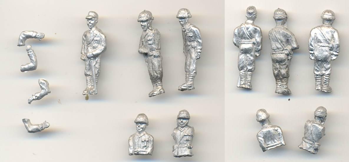 Japanese tankers, which are woefully under-represented in our scale. The casting of these figures is rather rough, with prominent seam lines and quite a heavy texture. Poses are rather static and facial expressions somewhat caricatural. Detail of the uniforms is OK. You get three separate arms, where only three are required. With some clean-up and a decent paint job these figures will happily augment the recent offerings of Japanese armor. |