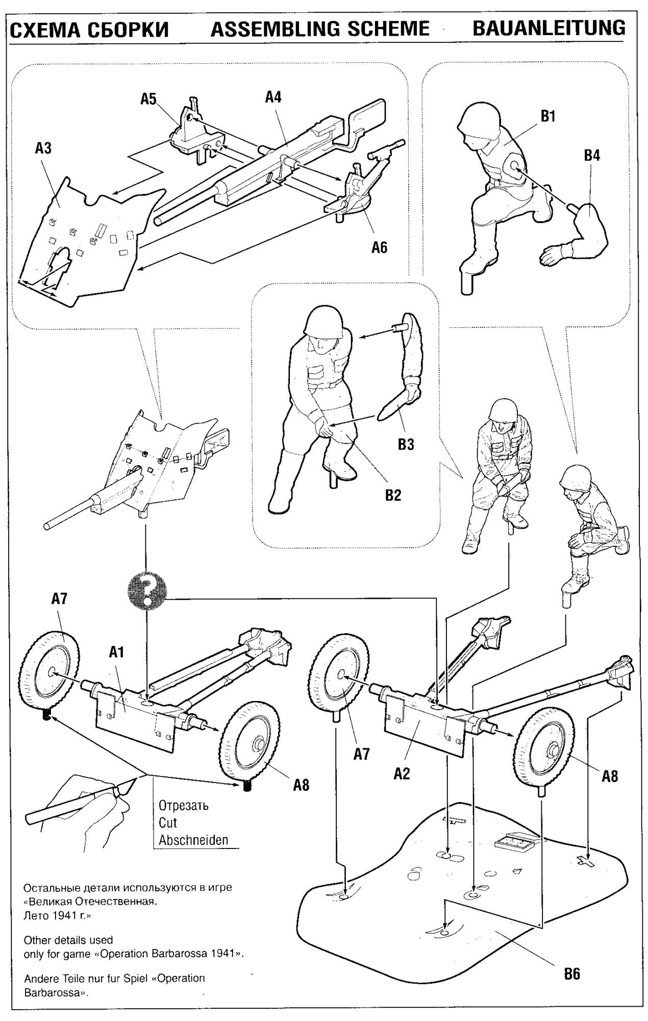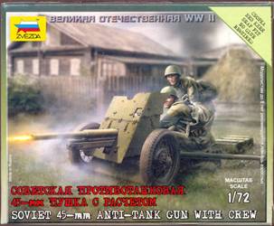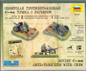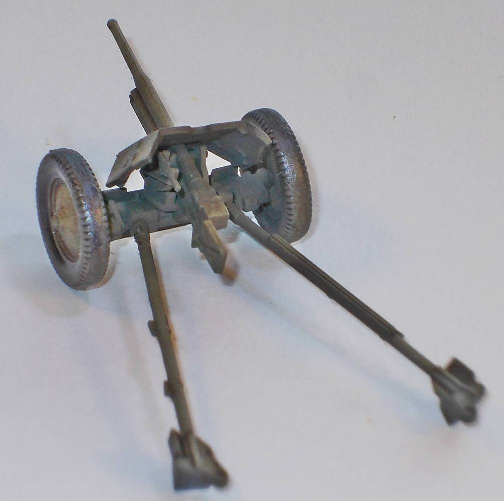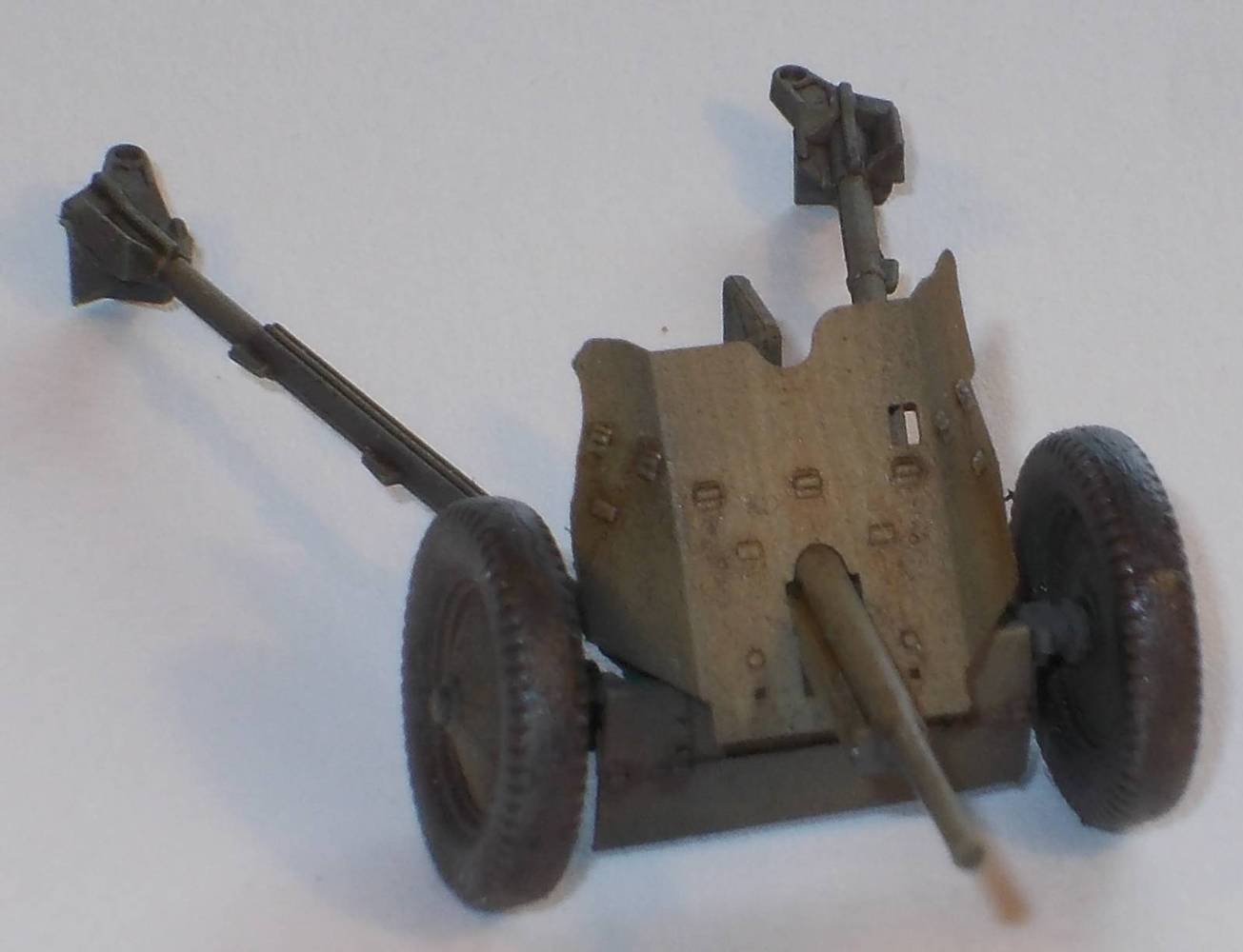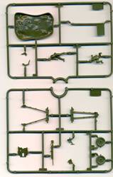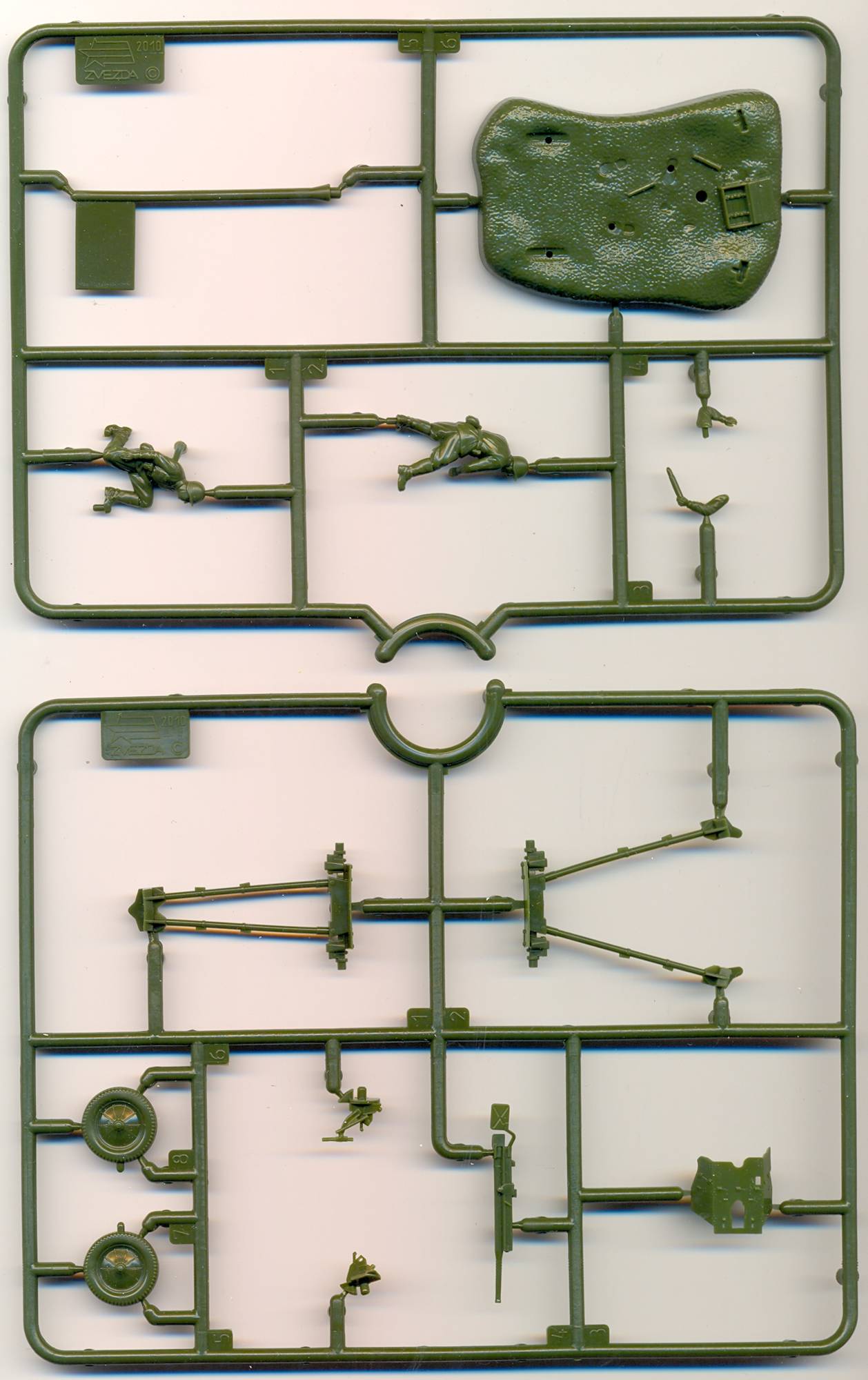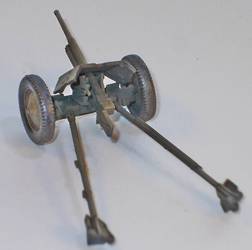 months, mostly aimed at the wargaming community. This is one of them. The two small sprues contain all the parts for the gun (even including optional parts for a gun in firing or in towing mode), two (mediocre) figures, a base, and a flag pole which - I guess - is solely for wargaming purposes. You also get a card and stats for the Art of Tactic wargame. As far as I know, this gun, which is basically a scaled up version of Rheinmetal's Pak 36, came in two versions. While I have yet to discover the differences between the two models, it seems all guns had a carriage with spoked wheels, which the kit has not. Minor details also seem to be missing, but as I bought this gun to fit inside a bunker, only exposing the front, this was not an issue for me. In all, it captures the look of the real thing. Due to the softness of the plastic it is very difficult to keep everything straight, but - surprisingly - the plastic holds paint quite well. Pictures of the gun in a diorama can be found here. |