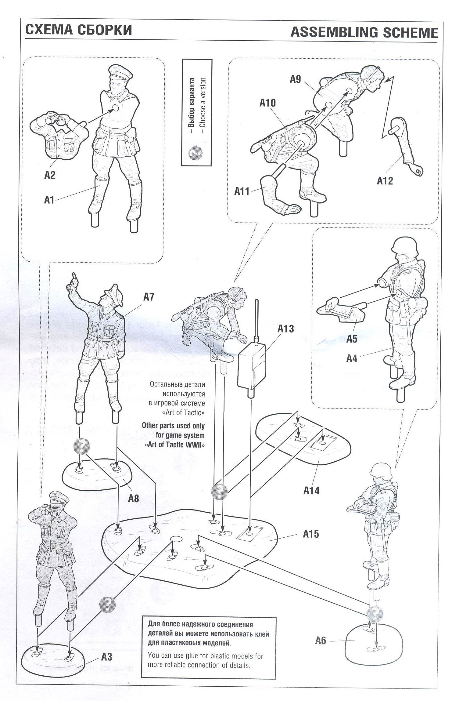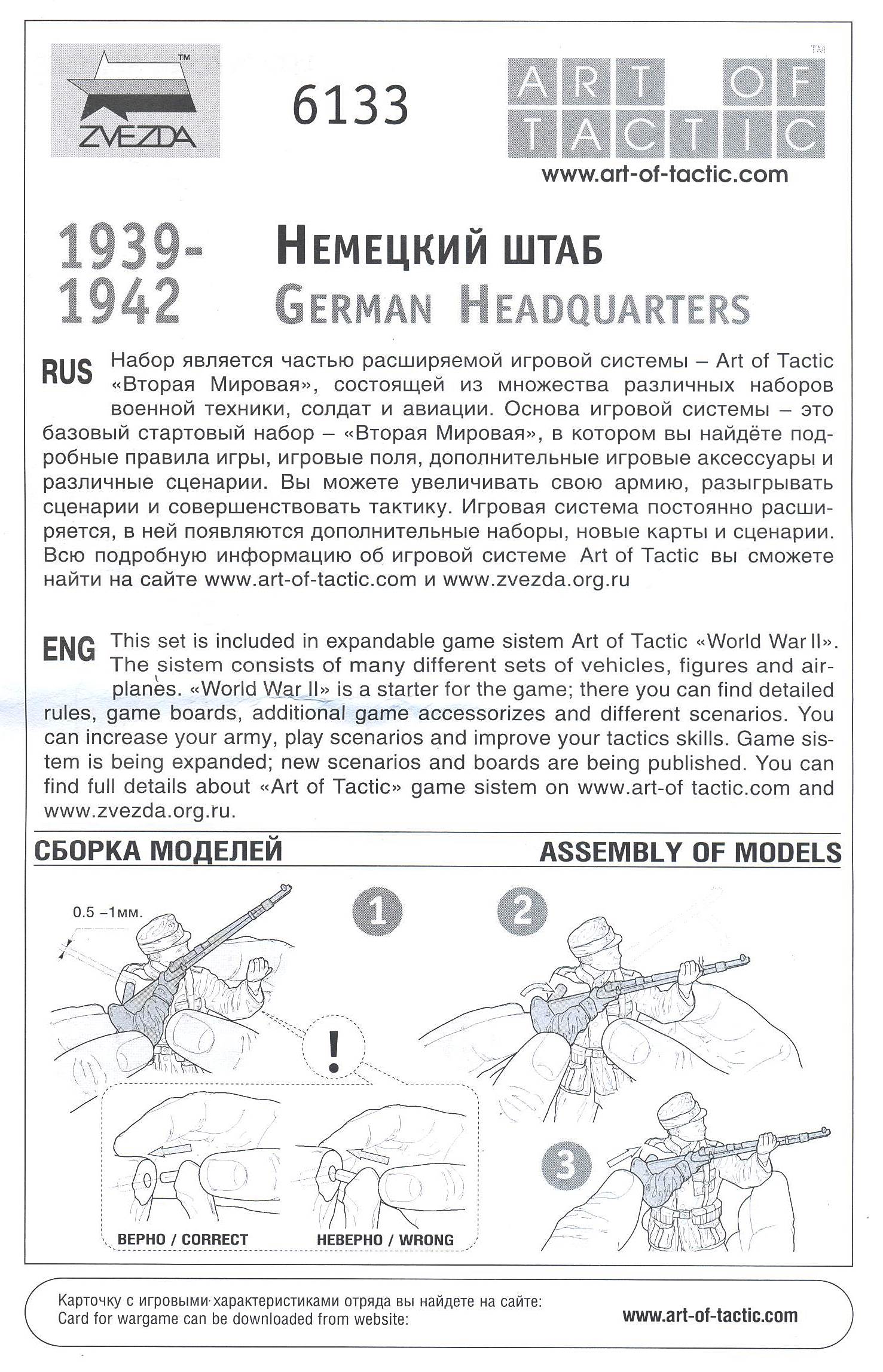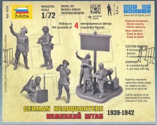 While primarily aimed at the wargaming community (witnessed by the base with oversized banner, the wargaming stats on the back of the box and on the playing card inside), this typical 4-figure Zvezda set is a very welcome addition to the figure collection of a static modeler, as they carry a high diorama potential. As usual, the front and back of the box leave little to the imagination. Inside the small end opening box is a single sprue of fairly hard grey plastic. This contains the parts to assemble four figures. A large part of this sprue is taken up by a banner and four base plates, which the display modeler will probably not use (except during painting). For those who are interested, the bases offer the option of grouping the four figures together or giving each figure its own base. The four